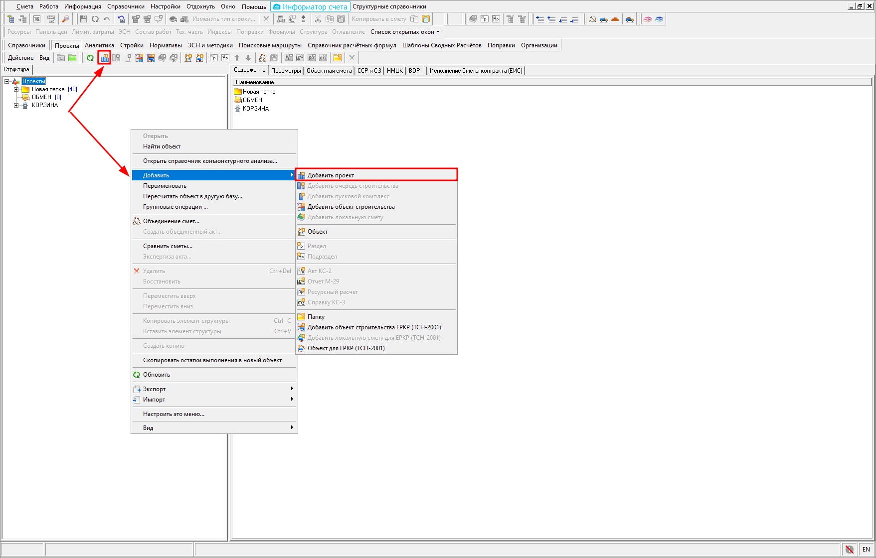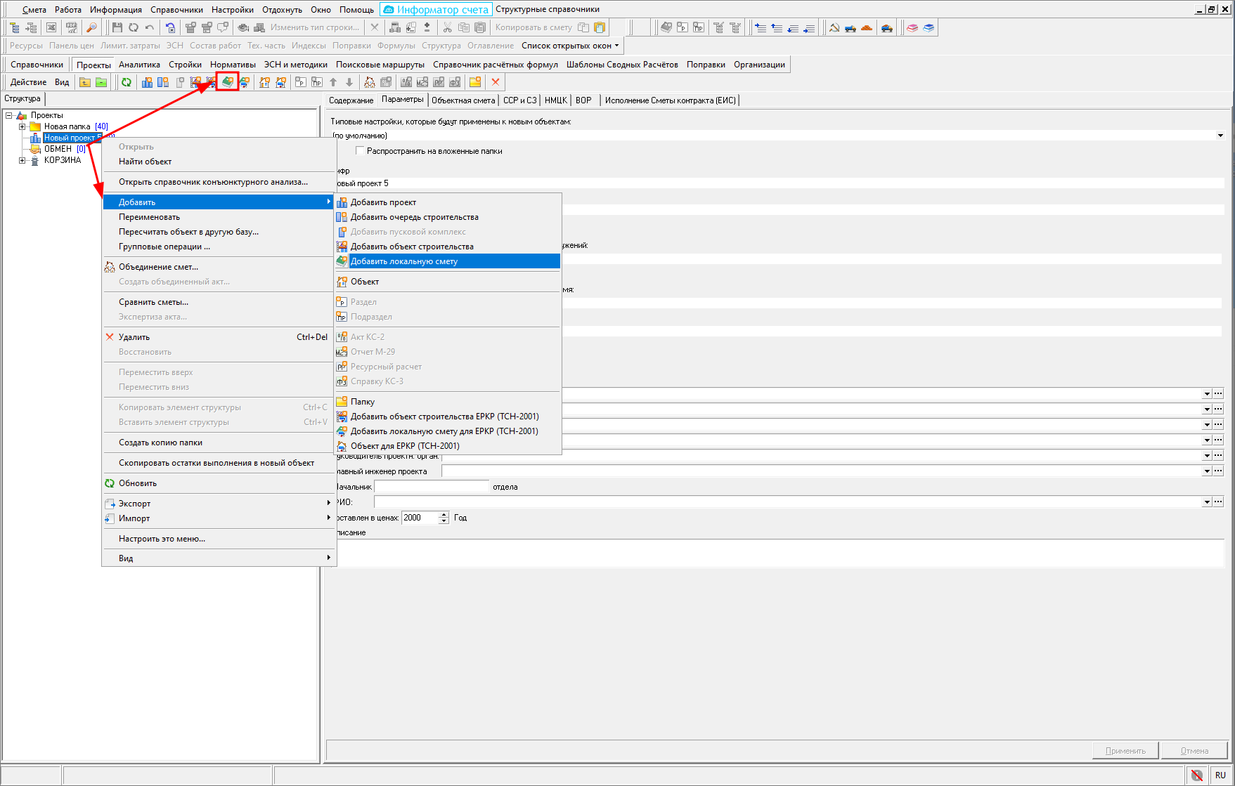 На проекте нажмите правой кнопкой мыши и выберите пункт "Добавить" - "Добавить локальную смету", либо нажмите соответствующую кнопку на панели инструментов