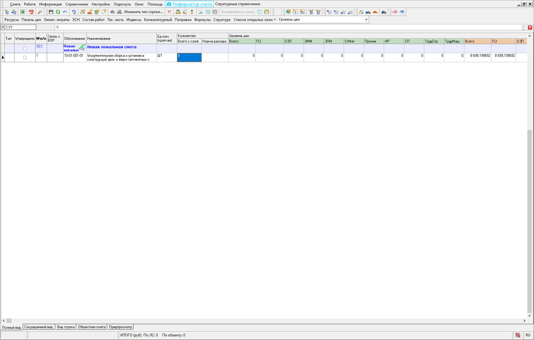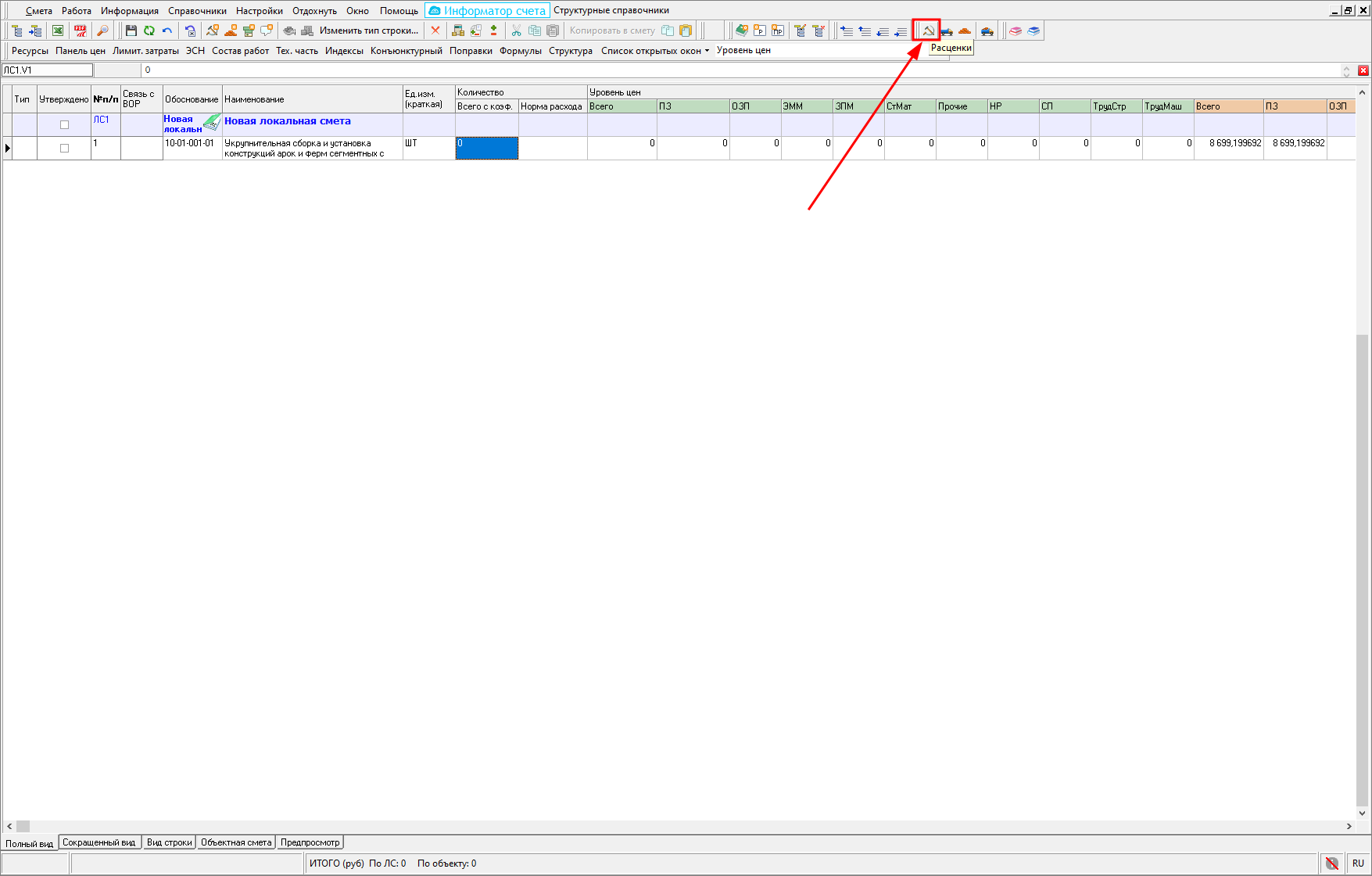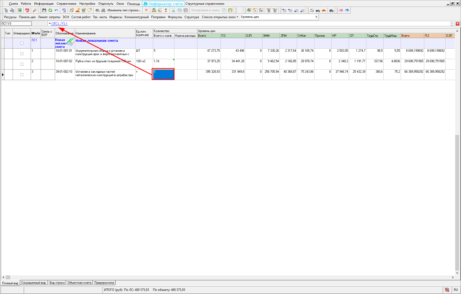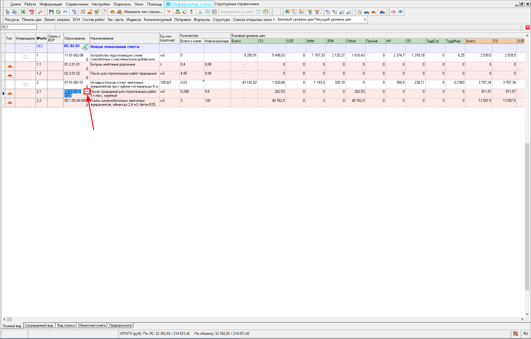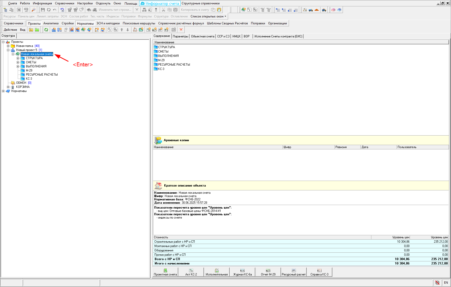 Или в структурной части окна выделите смету и нажмите клавишу Enter