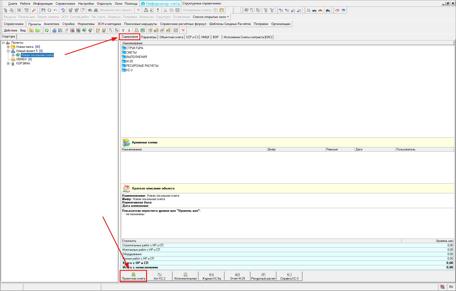 Для того, чтобы открыть смету, перейдите на вкладку "Содержание" и нажмите "Проектная смета"