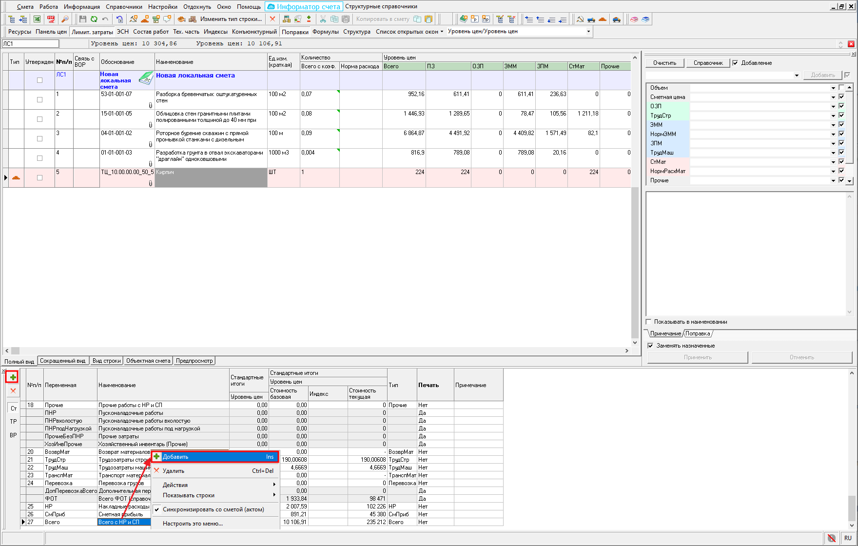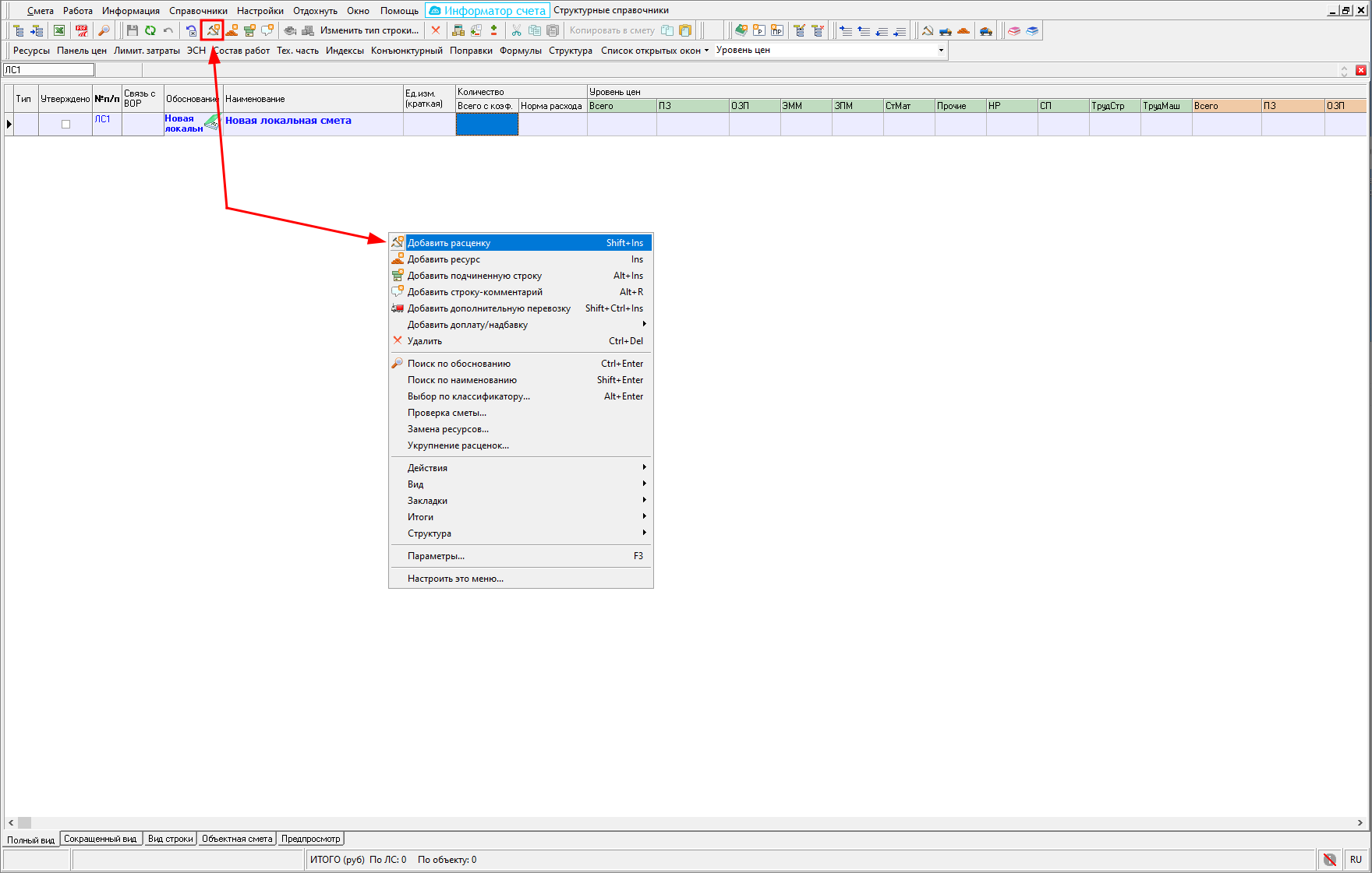 В открытой смете нажмите правой кнопкой мыши и выберите пункт "Добавить расценку" либо нажмите соответствующую кнопку в панели инструментов