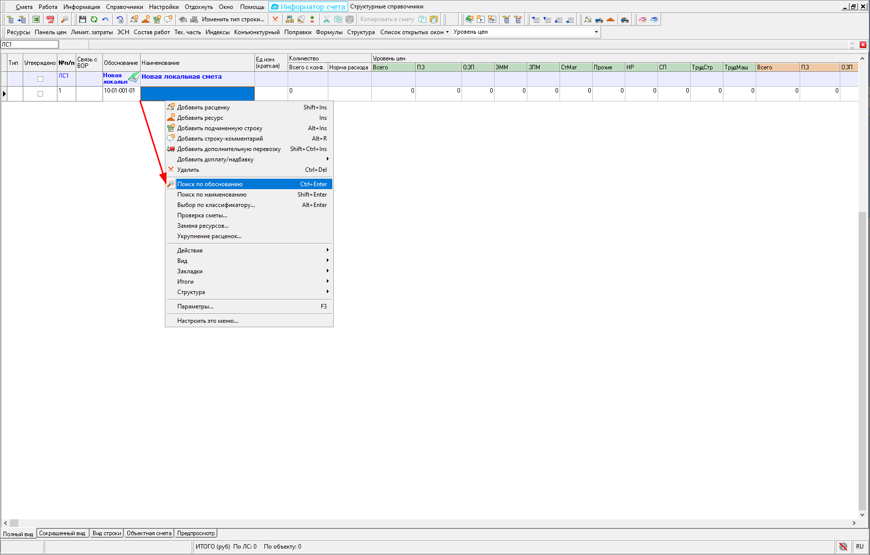 В колонке "Обоснование" внесите шифр расценки, нажмите правой кнопкой мыши и выберите пункт "Поиск по обоснованию" (сочетание клавиш Ctrl+Enter)