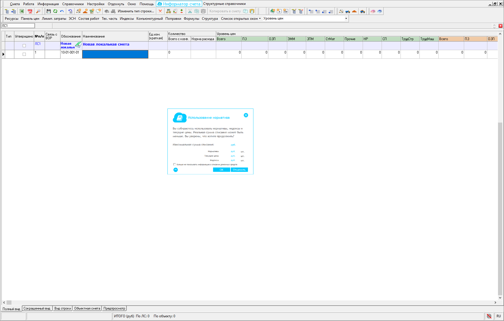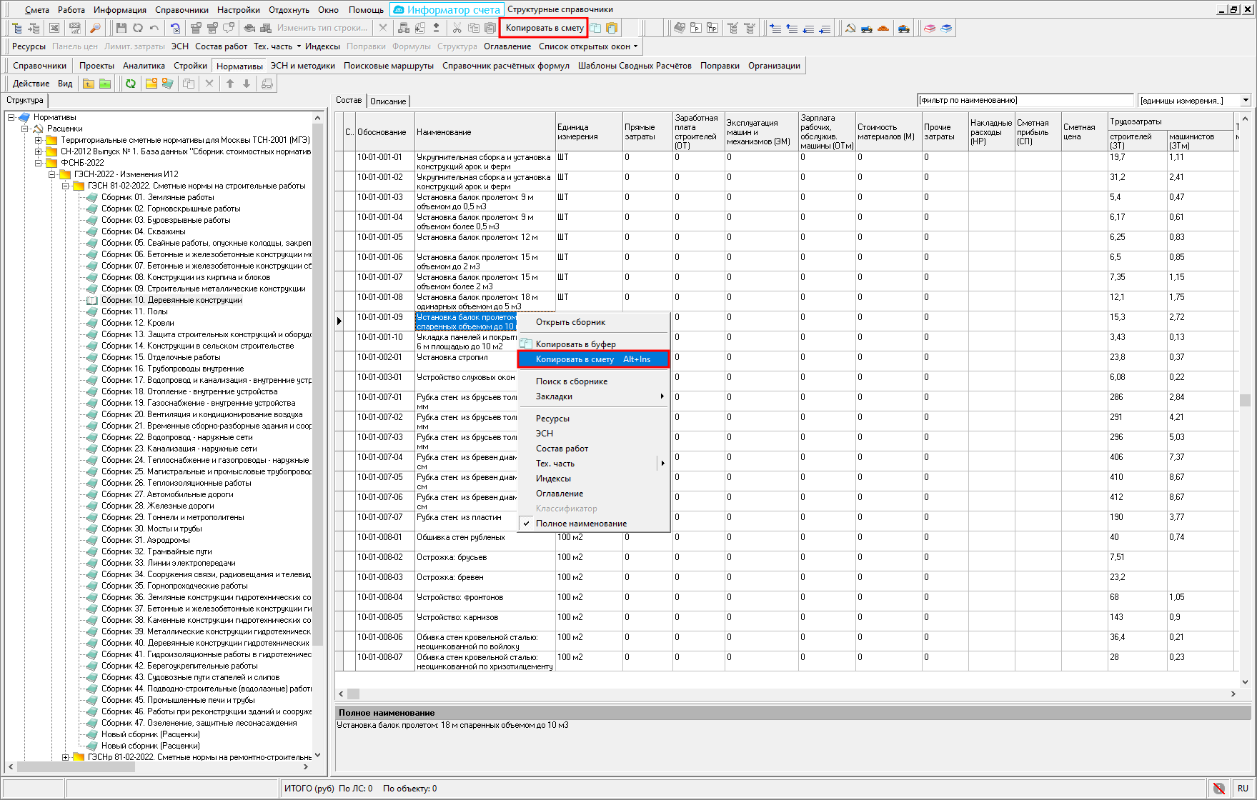 Выберите расценку, нажмите на ней правой кнопкой мыши и выберите "Копировать в смету" или нажмите аналогичную кнопку на панели инструментов. Подтвердите списание средств за использование норматива