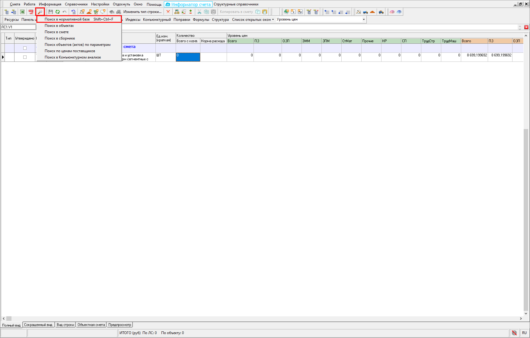 В открытой смете нажмите кнопку поиска на панели инструментов, выберите поиск в нормативной базе (сочетание клавиш Shift+Ctrl+F)