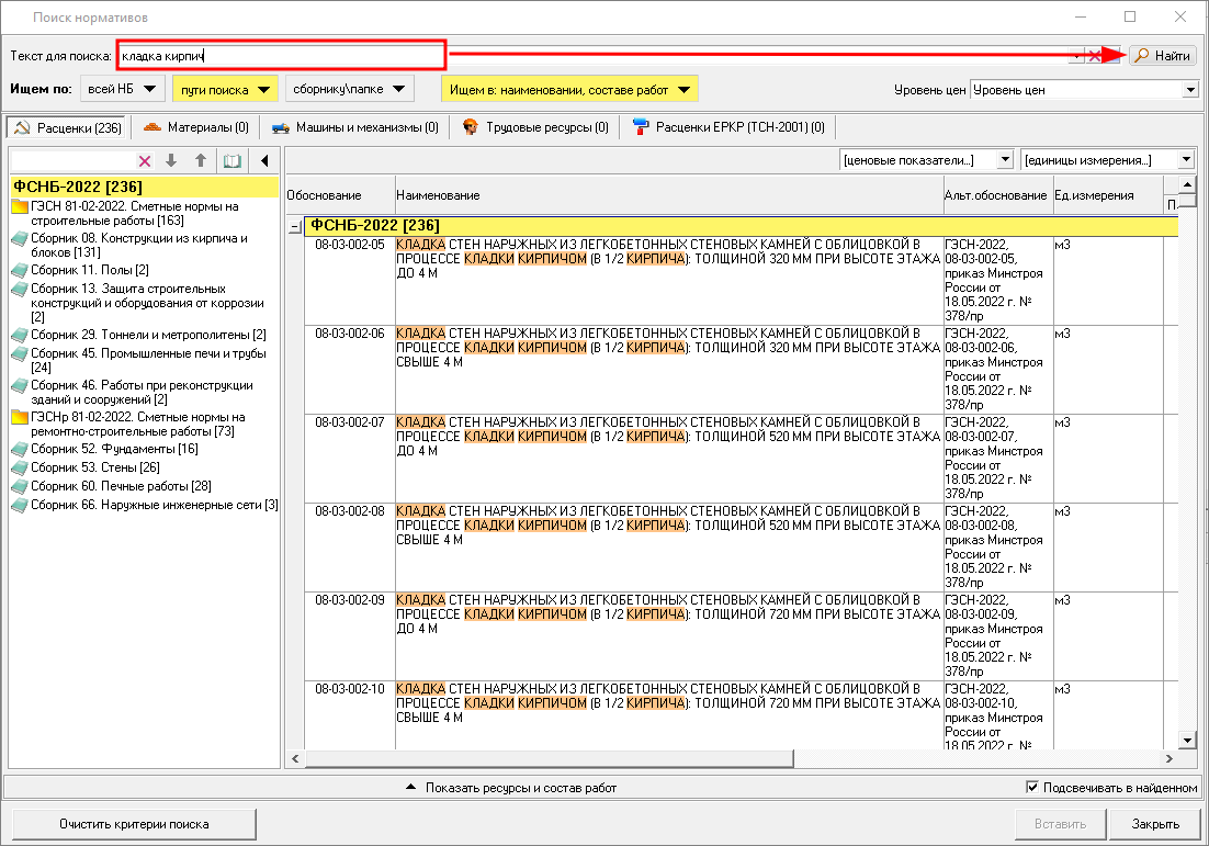 Будет открыт сборник ФСБЦ-2022, выберите необходимую книгу и нажмите "Выбрать". В ней выберите нужный ресурс, можно воспользоваться поиском (правой кнопкой мыши - "Поиск в сборнике") и нажмите "Выбрать".