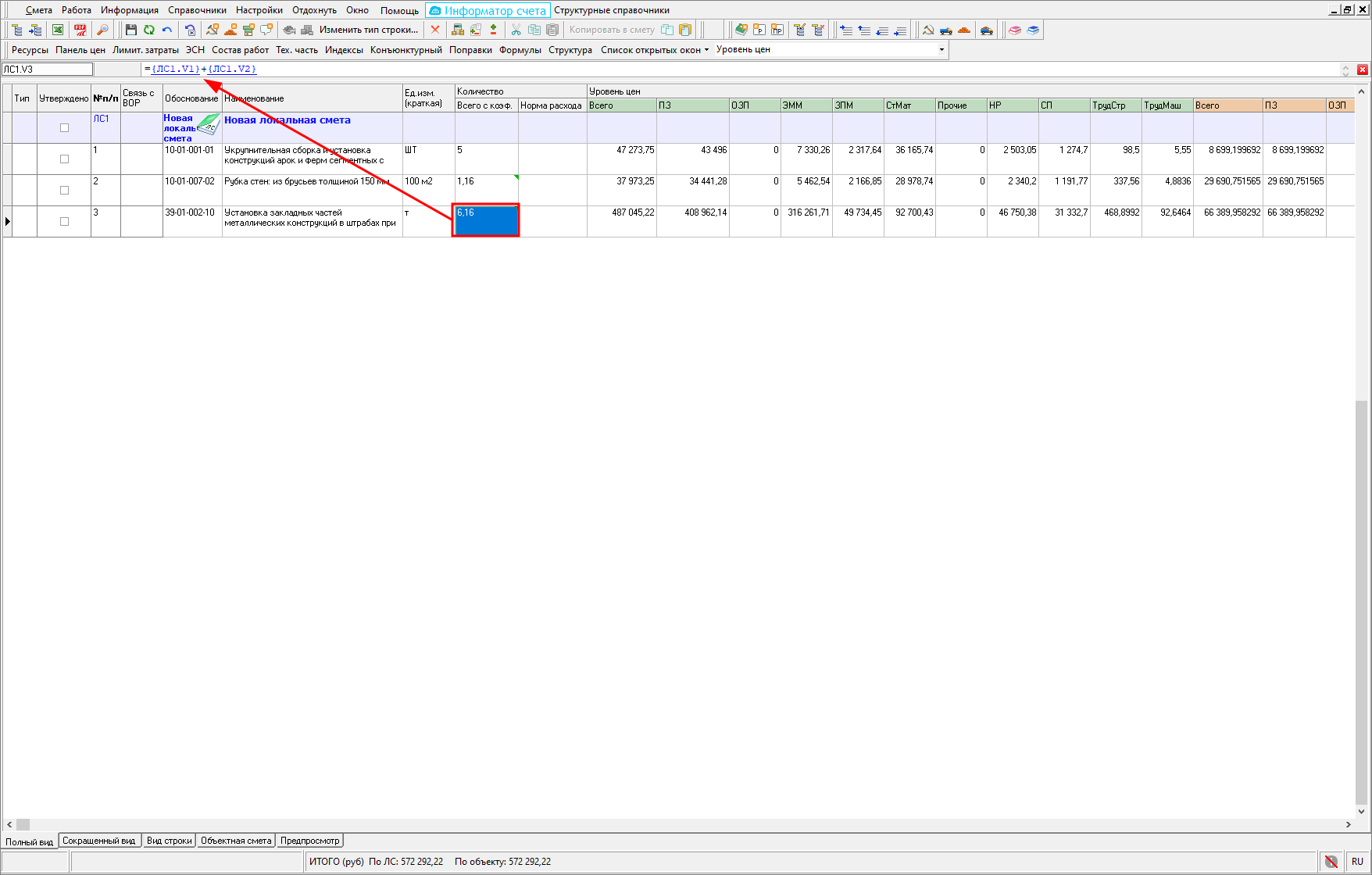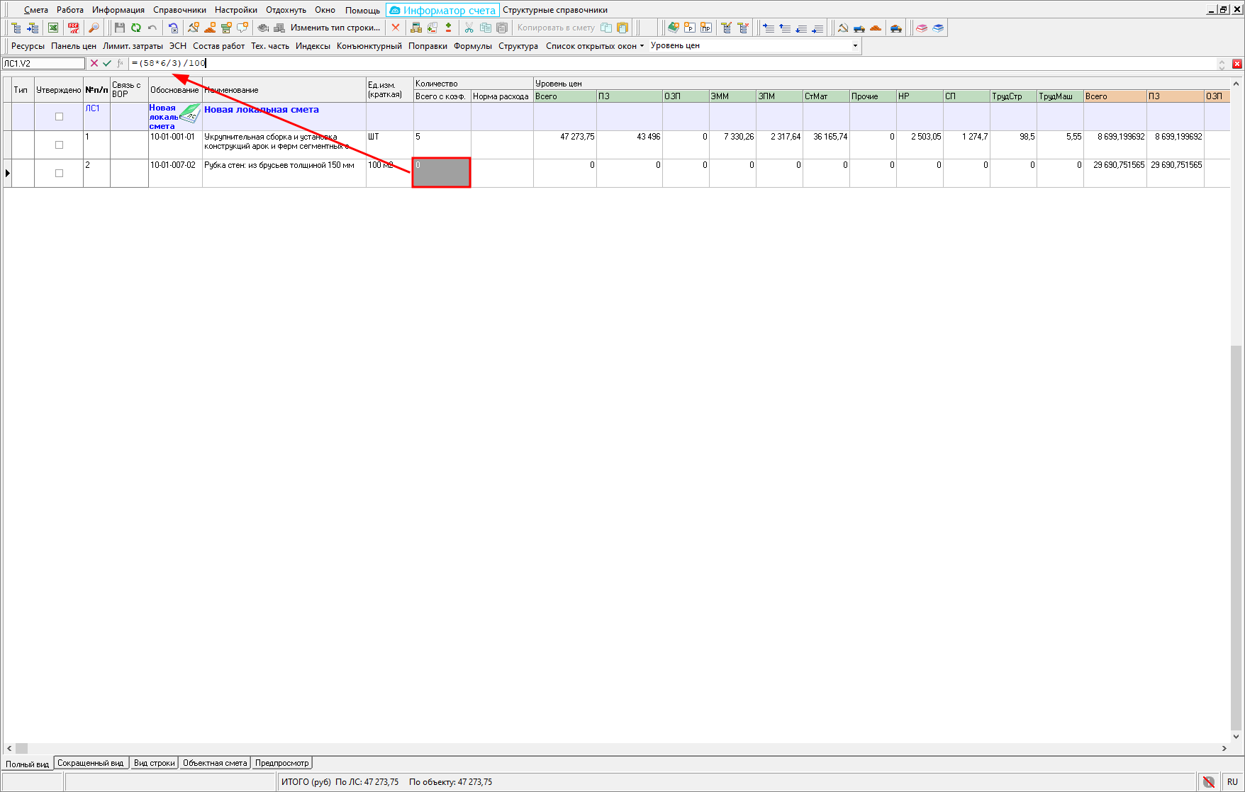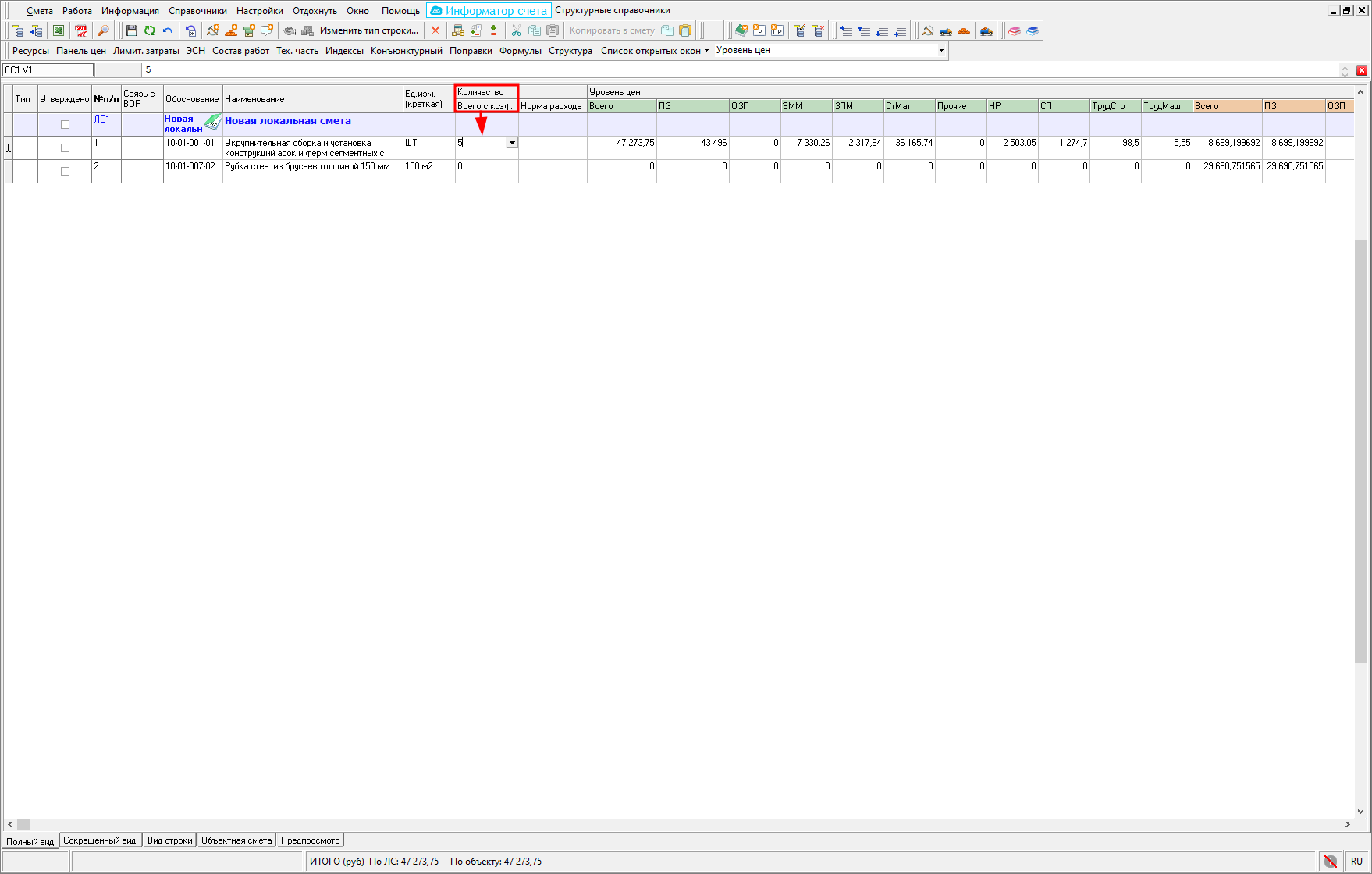 В открытой смете на строке в колонке "Количество" внесите объем с клавиатуры и нажмите клавишу Enter