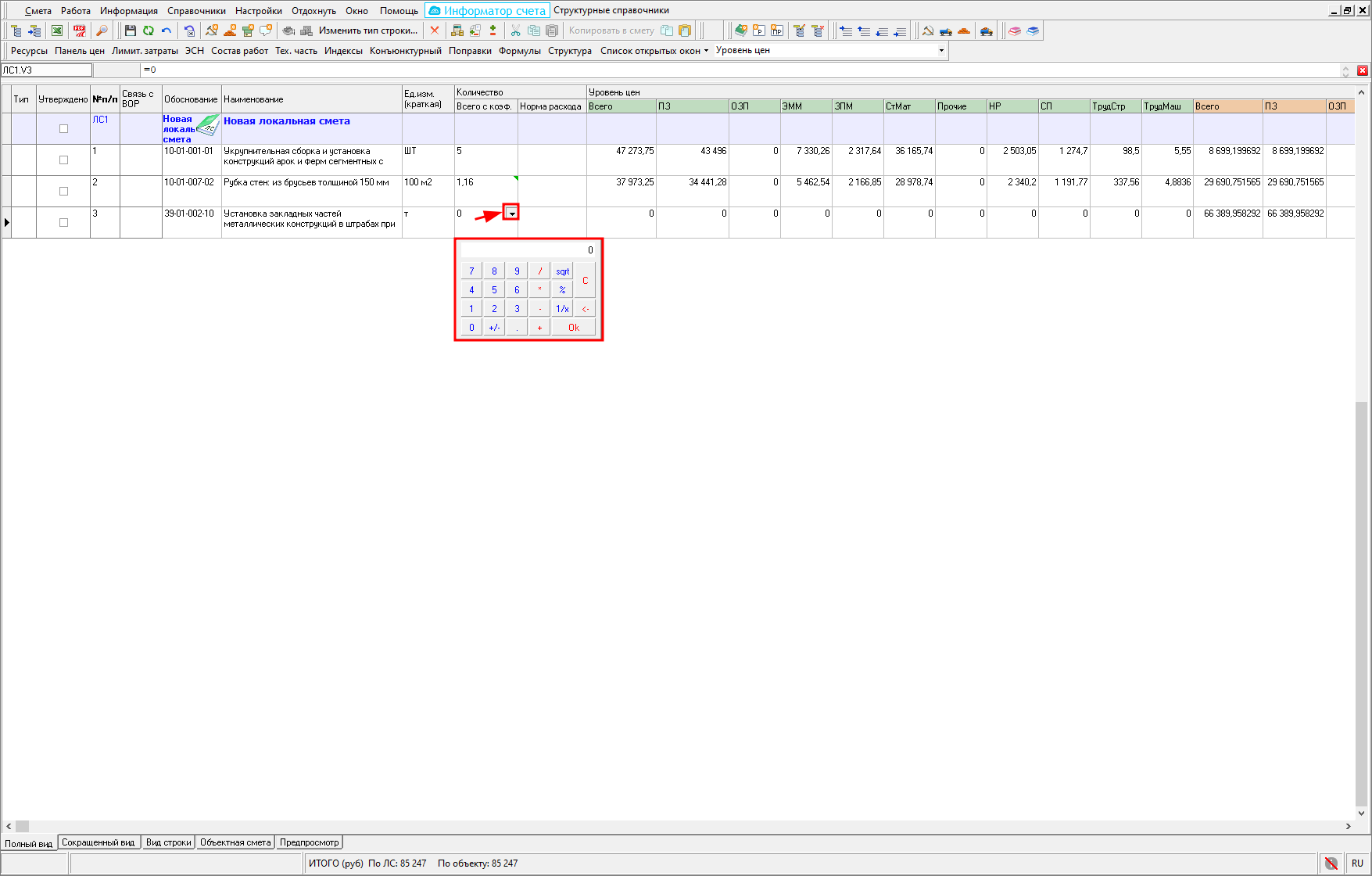 В открытой смете на строке в колонке "Количество" нажмите левой кнопкой мыши один раз и нажмите на треугольник. Будет открыт калькулятор, внесите расчет объема и нажмите клавишу Enter