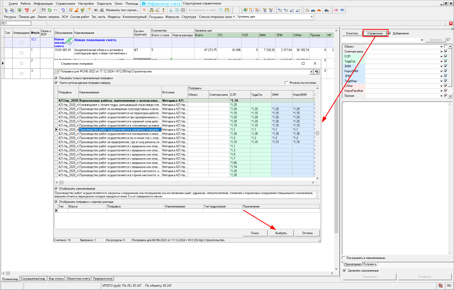 На панели "Поправки" нажмите "Справочник". В открывшемся окне "Справочник поправок" выберите поправку (одну или несколько) и нажмите "Выбрать"