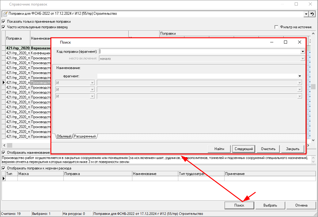 Для поиска поправок по коду или наименованию нажмите "Поиск" или нажмите правой кнопкой мыши и выберите "Поиск". Внесите фрагмент кода или наименования поправки и нажмите "Найти"