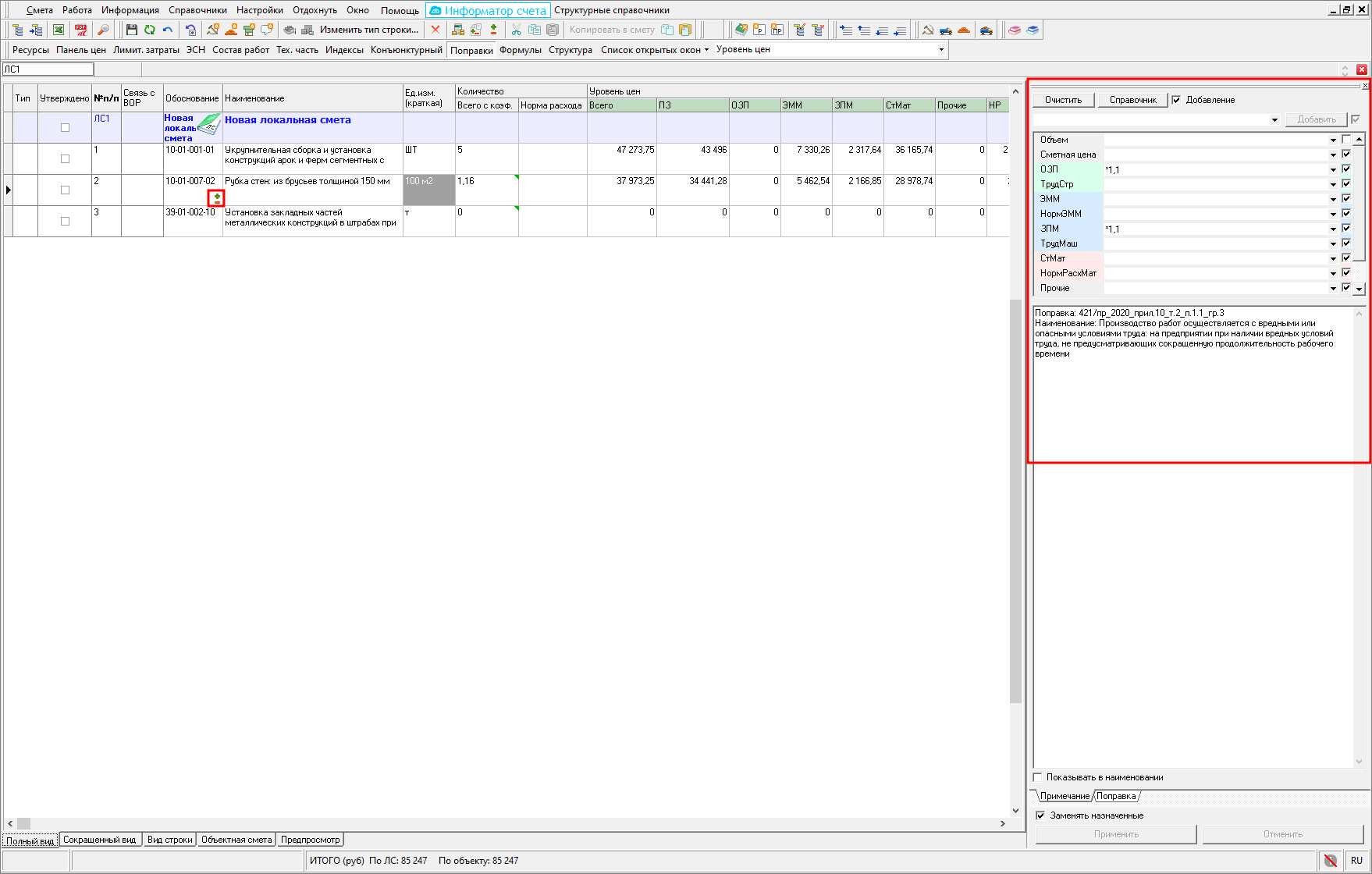 После применения поправки в панели "Поправки" будет отображена назначенная поправка и в колонке "Обоснование" появится индикатор назначения поправки (индикацию можно отключить в главном меню "Настройки" - "Параметры")