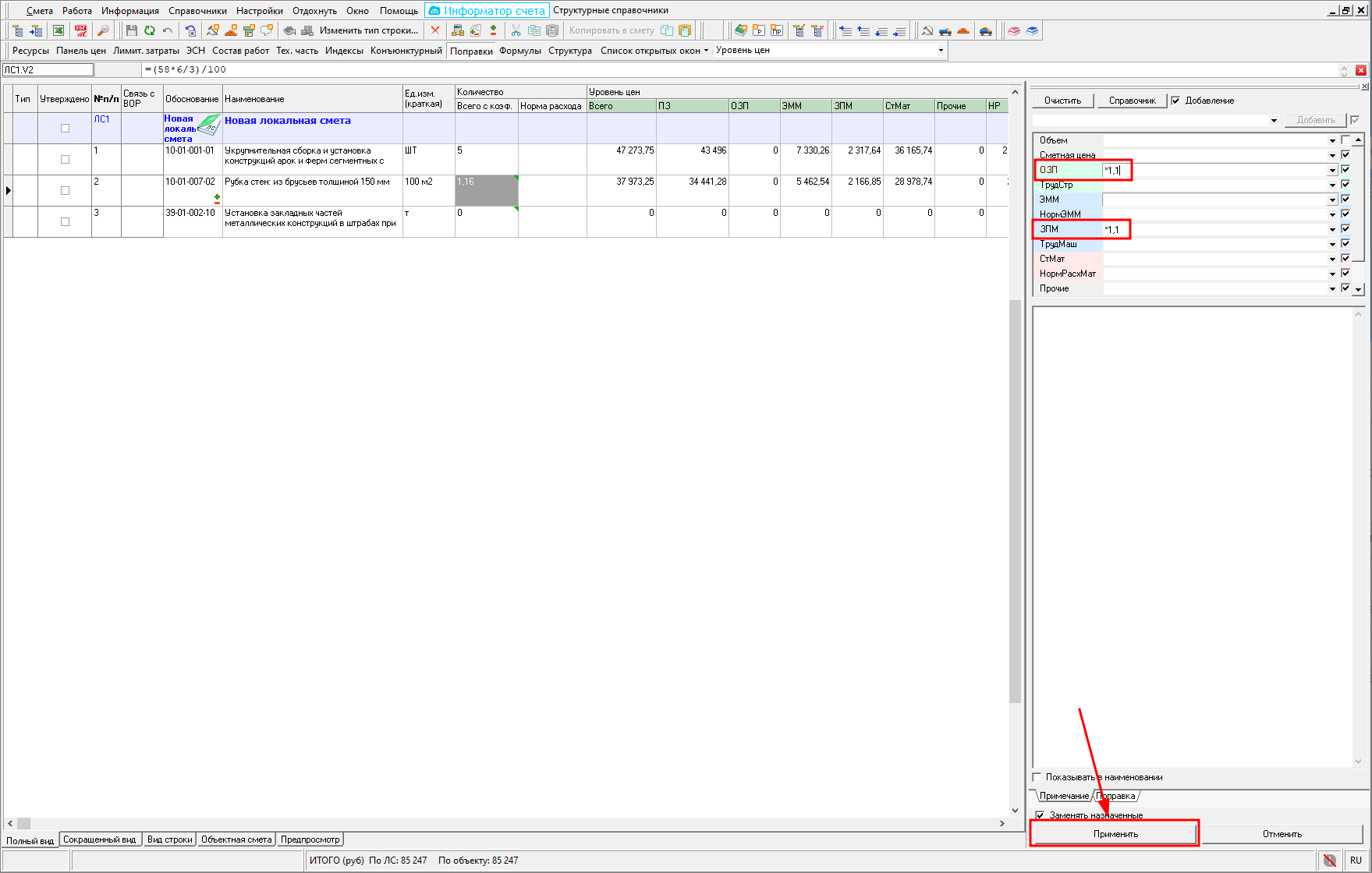 Для внесения поправок вручную в панели "Поправки" проставьте необходимые значения к статьям затрат, начиная со знака арифметического действия и нажмите "Применить"