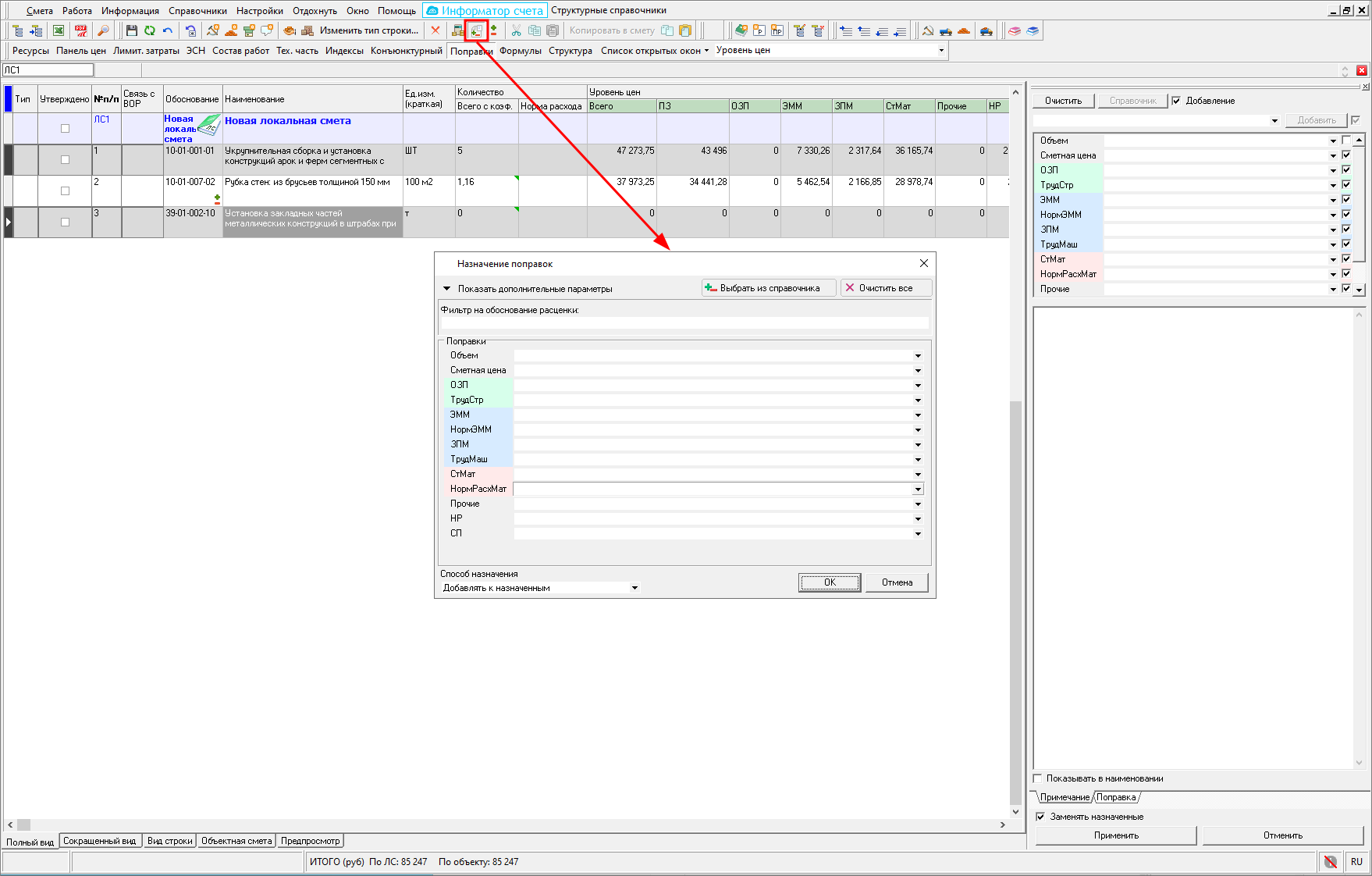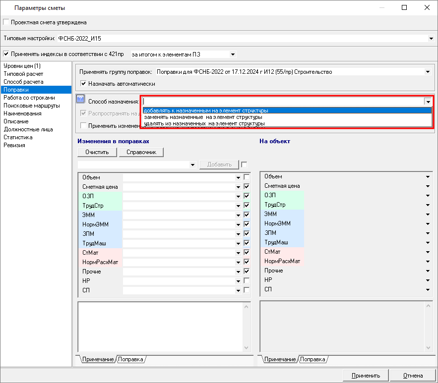 В параметрах сметы (F3) в разделе «Поправки» выберите способ назначения: