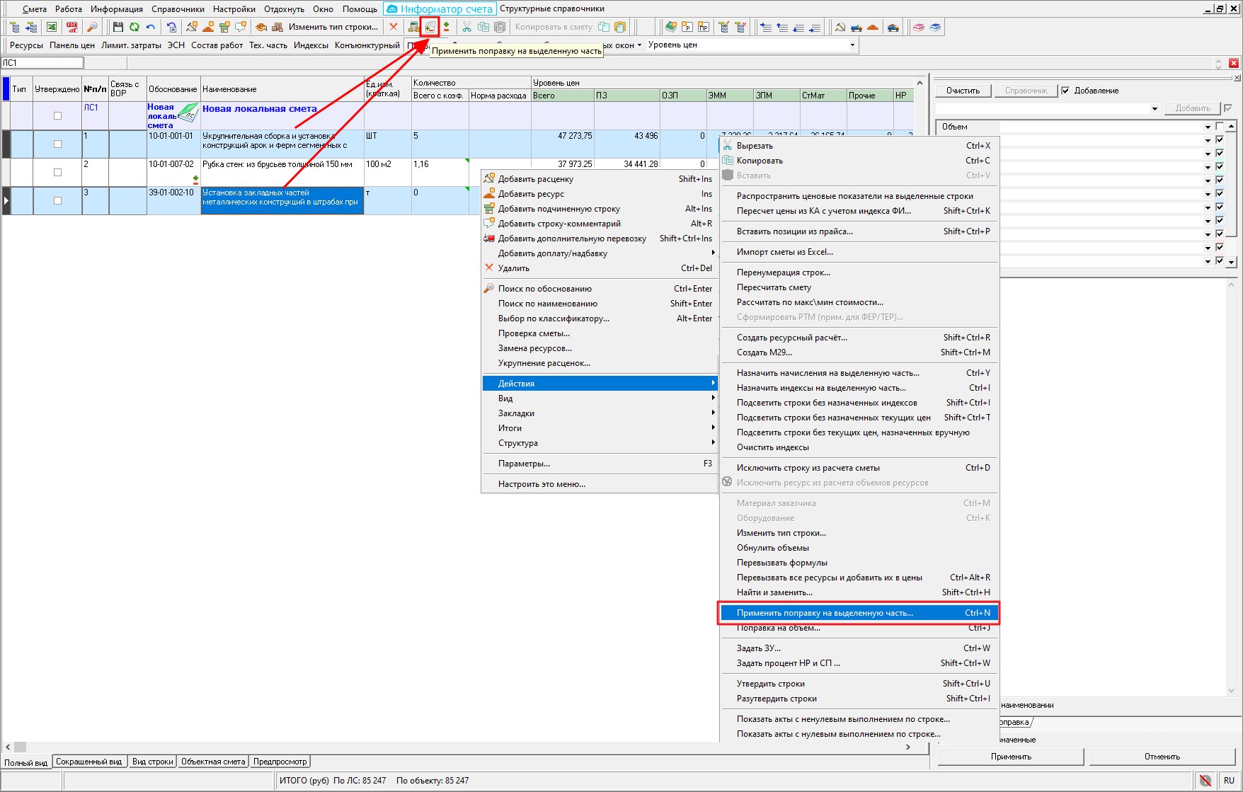 Для назначения поправки сразу на группу строк выделите их и на панели инструментов нажмите «Применить поправку на выделенную часть», либо в контекстном меню выберите "Действие" - аналогичный пункт