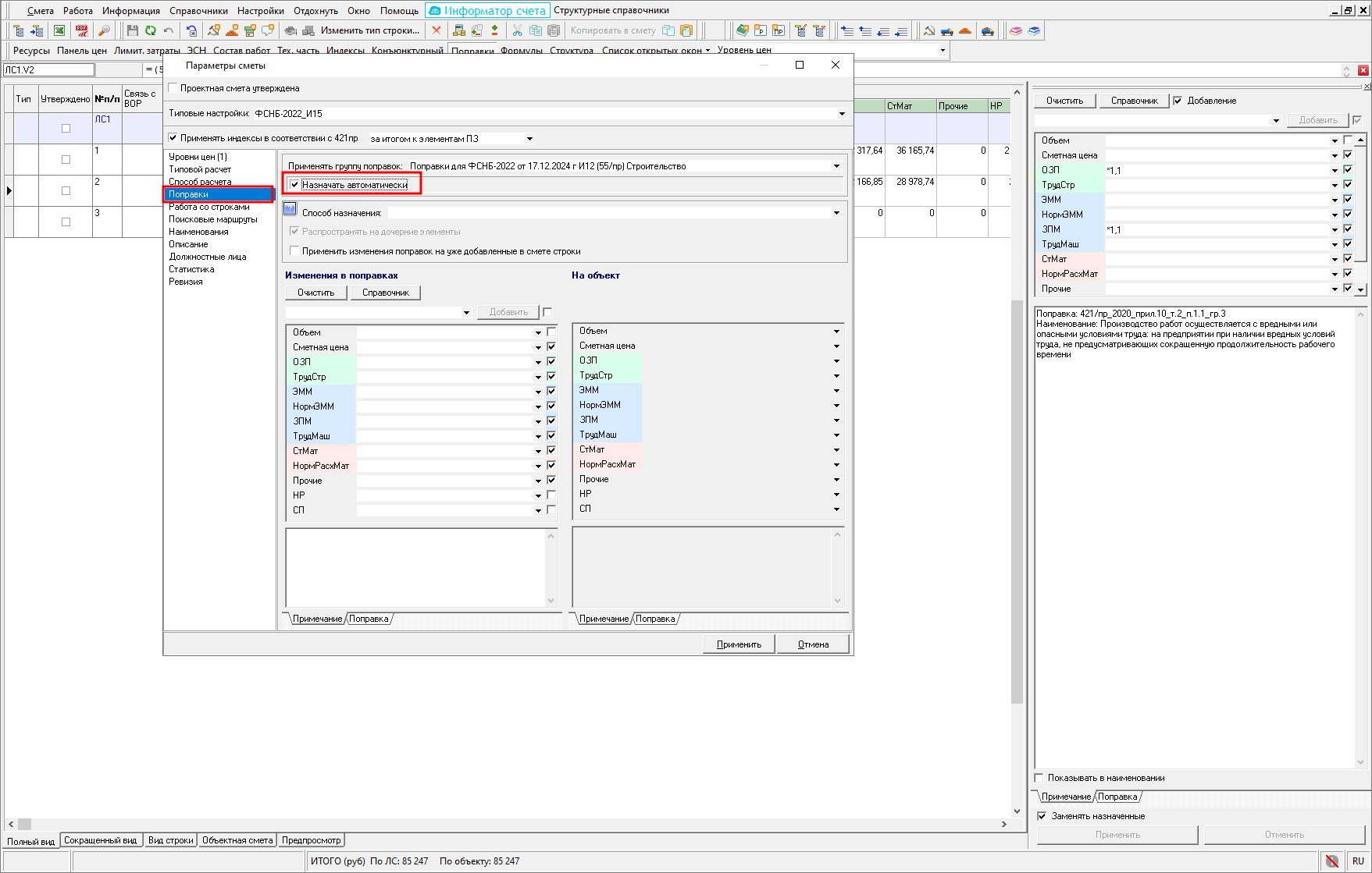 Для того, чтобы при добавлении норматива в смету автоматически открывалось окно назначения поправок, в параметрах сметы (F3) в разделе «Поправки» установите флажок «Назначать автоматически»