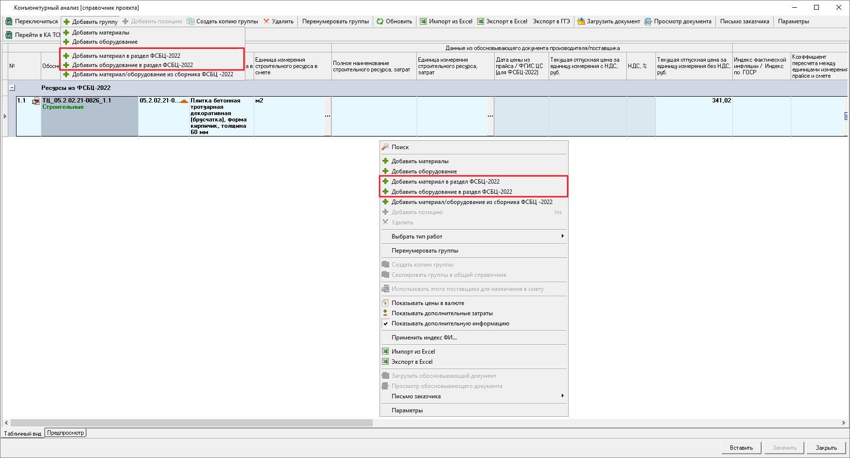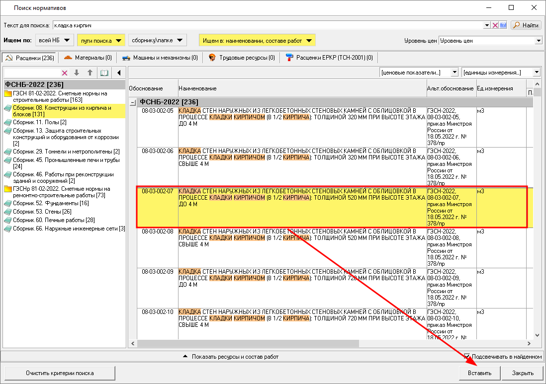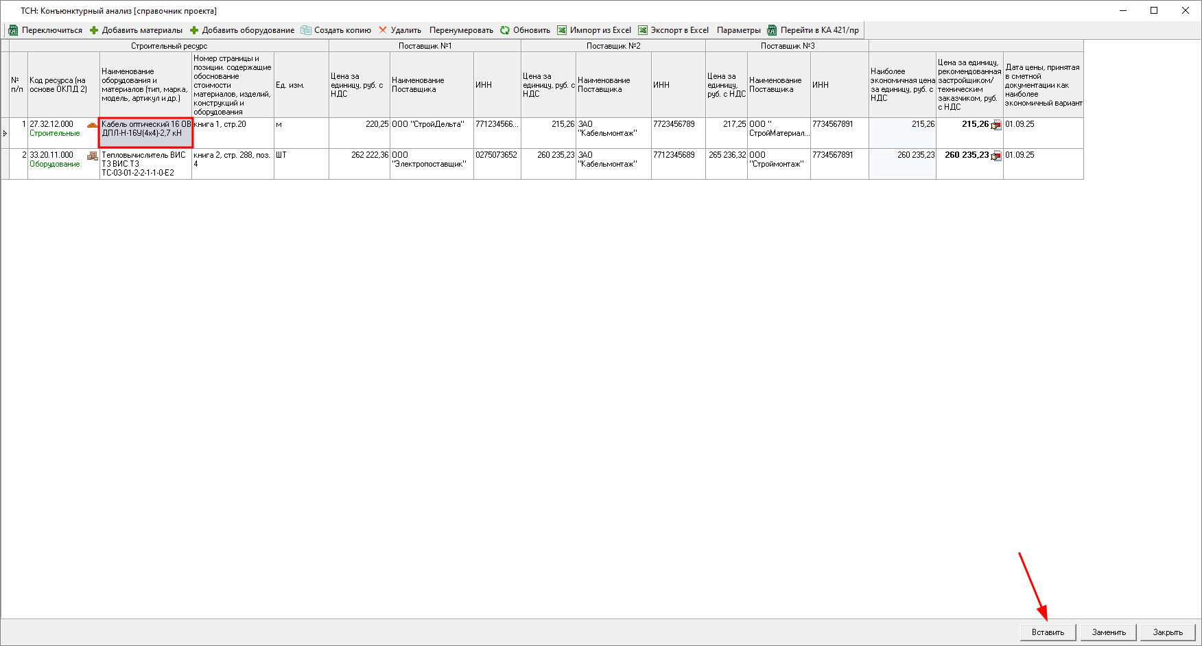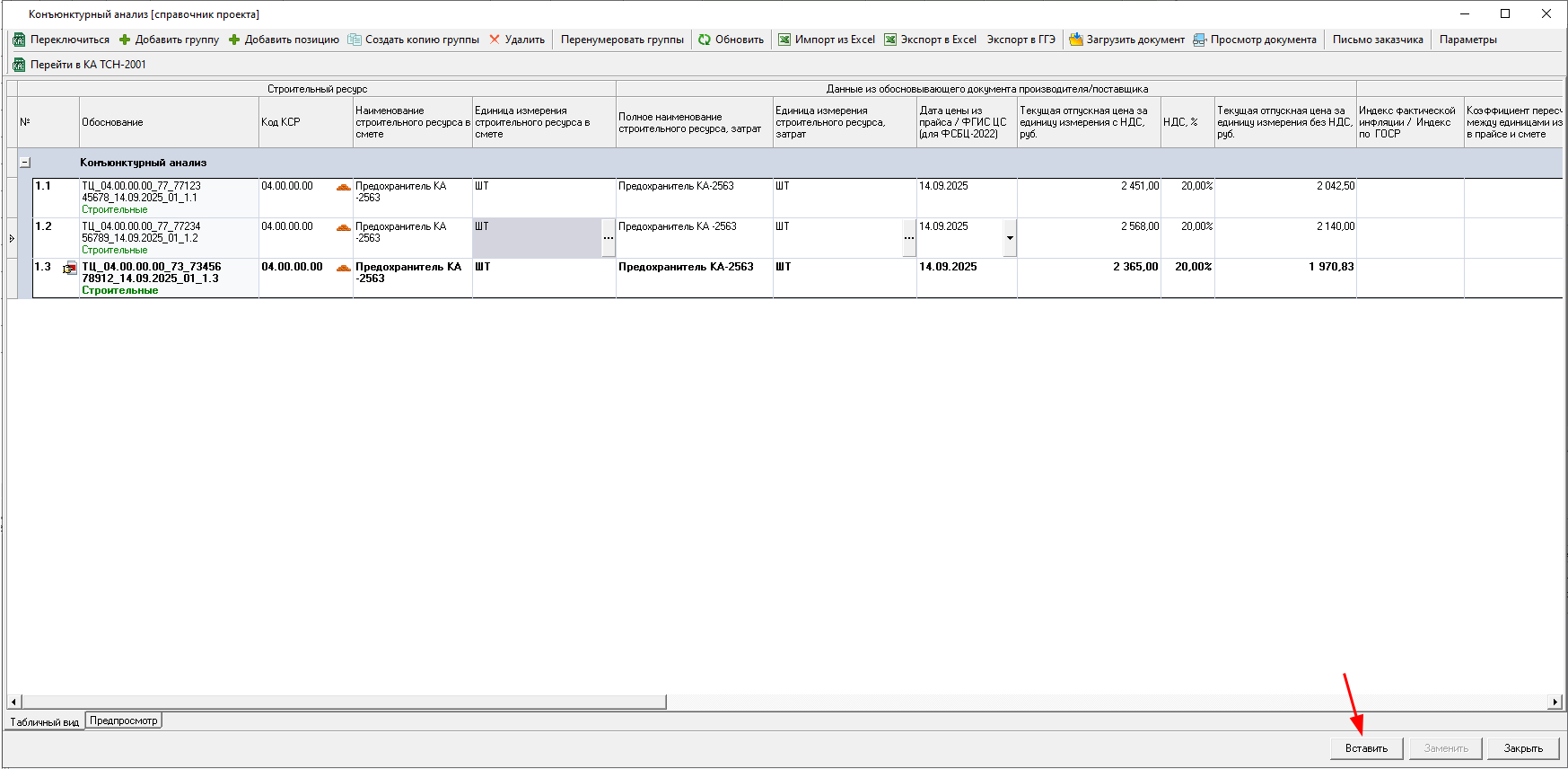 Для добавления строки из справочника конъюнктурного анализа в смету, выберите ее и нажмите "Вставить"
