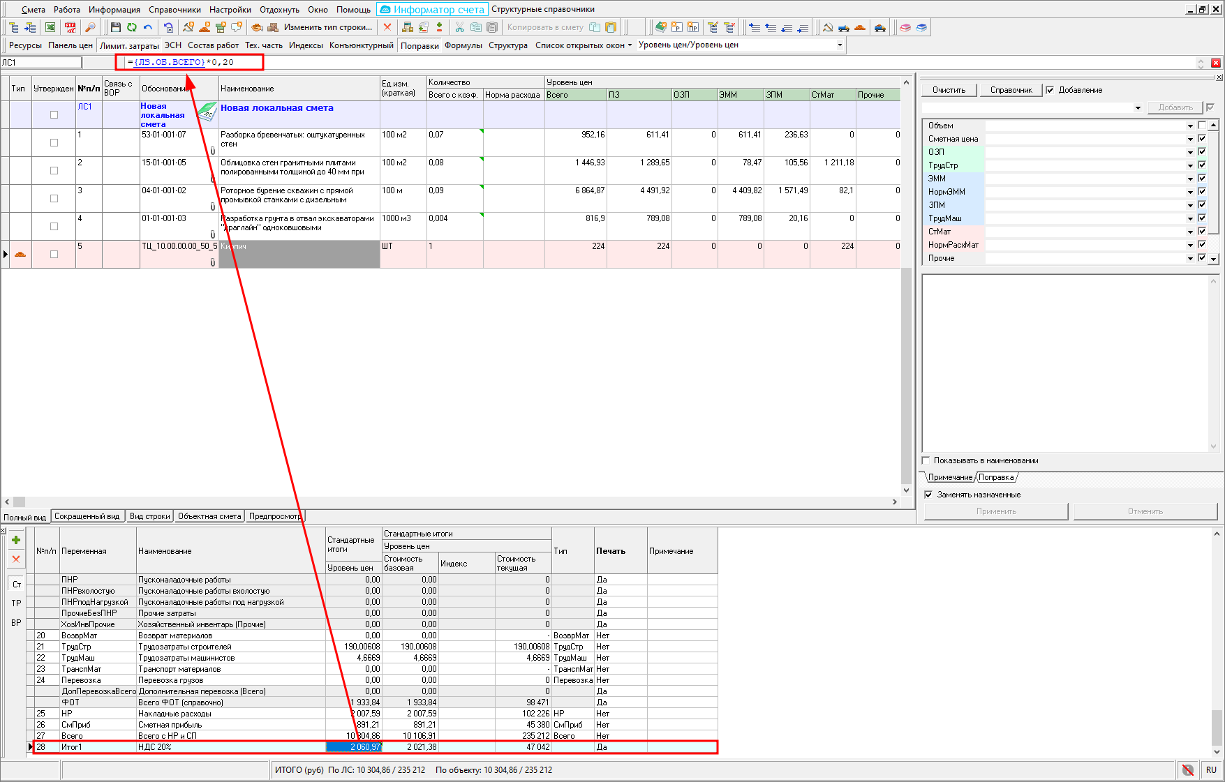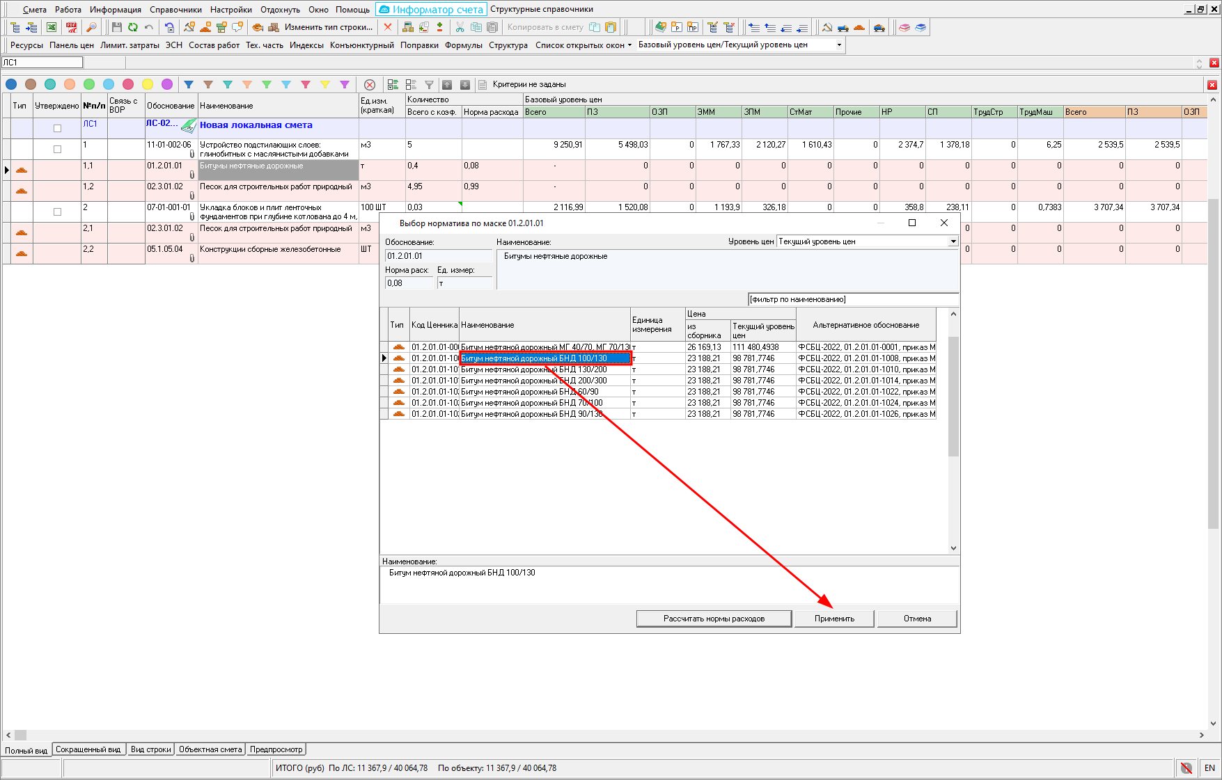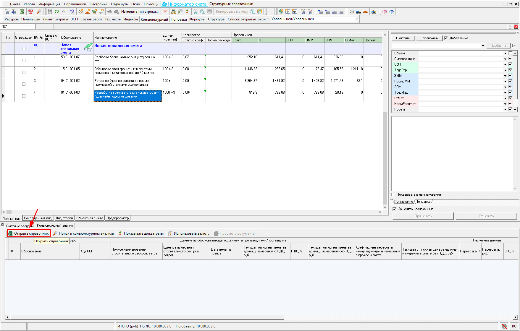 Для добавления строки из справочника конъюнктурного анализа в смету, выберите ее и нажмите "Вставить"