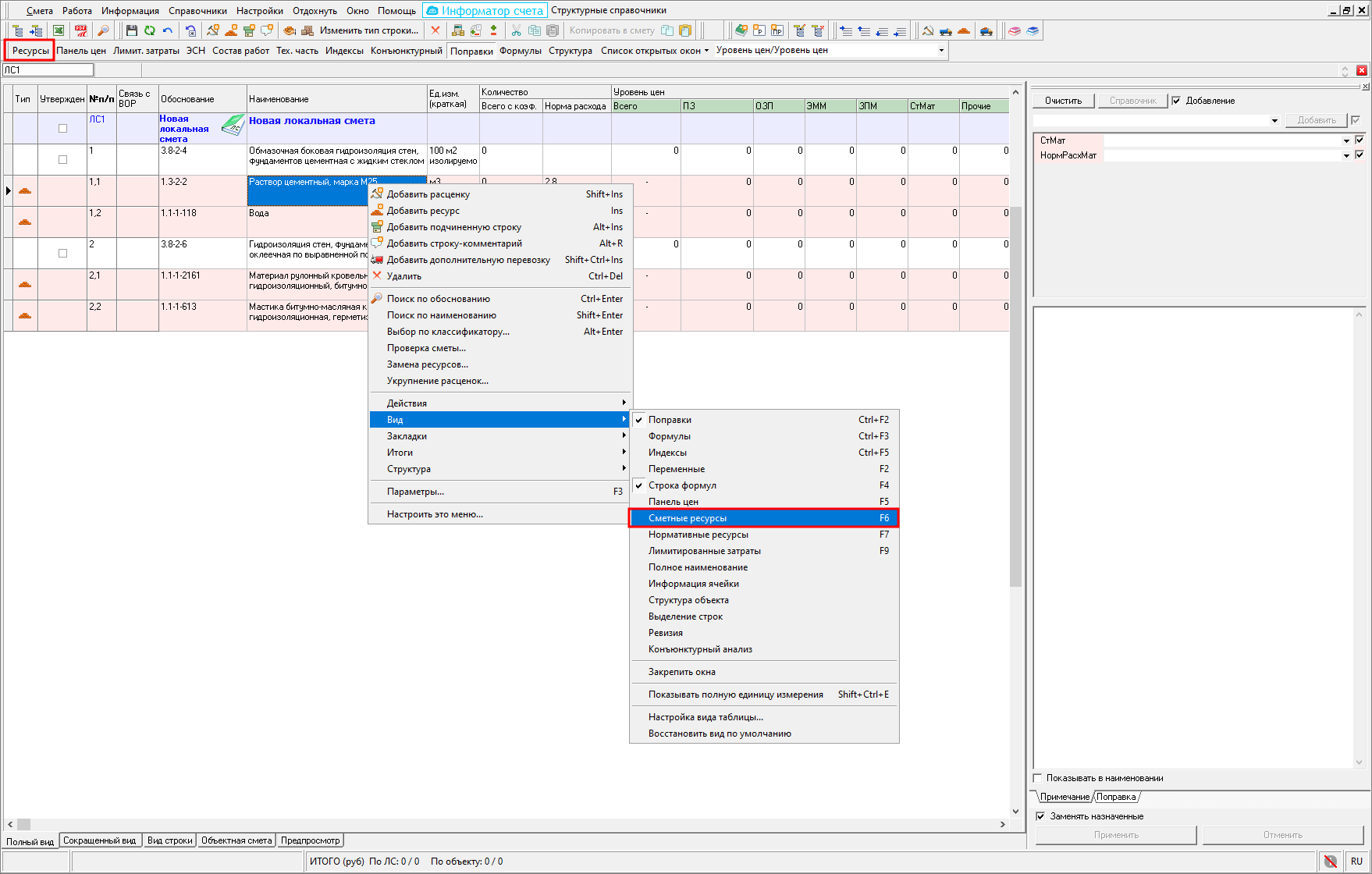 Для просмотра ресурсов, включенных в расценку нажмите на панели инструментов "Ресурсы" - "Сметные", либо правой кнопкой мыши - "Вид" - "Сметные ресурсы"