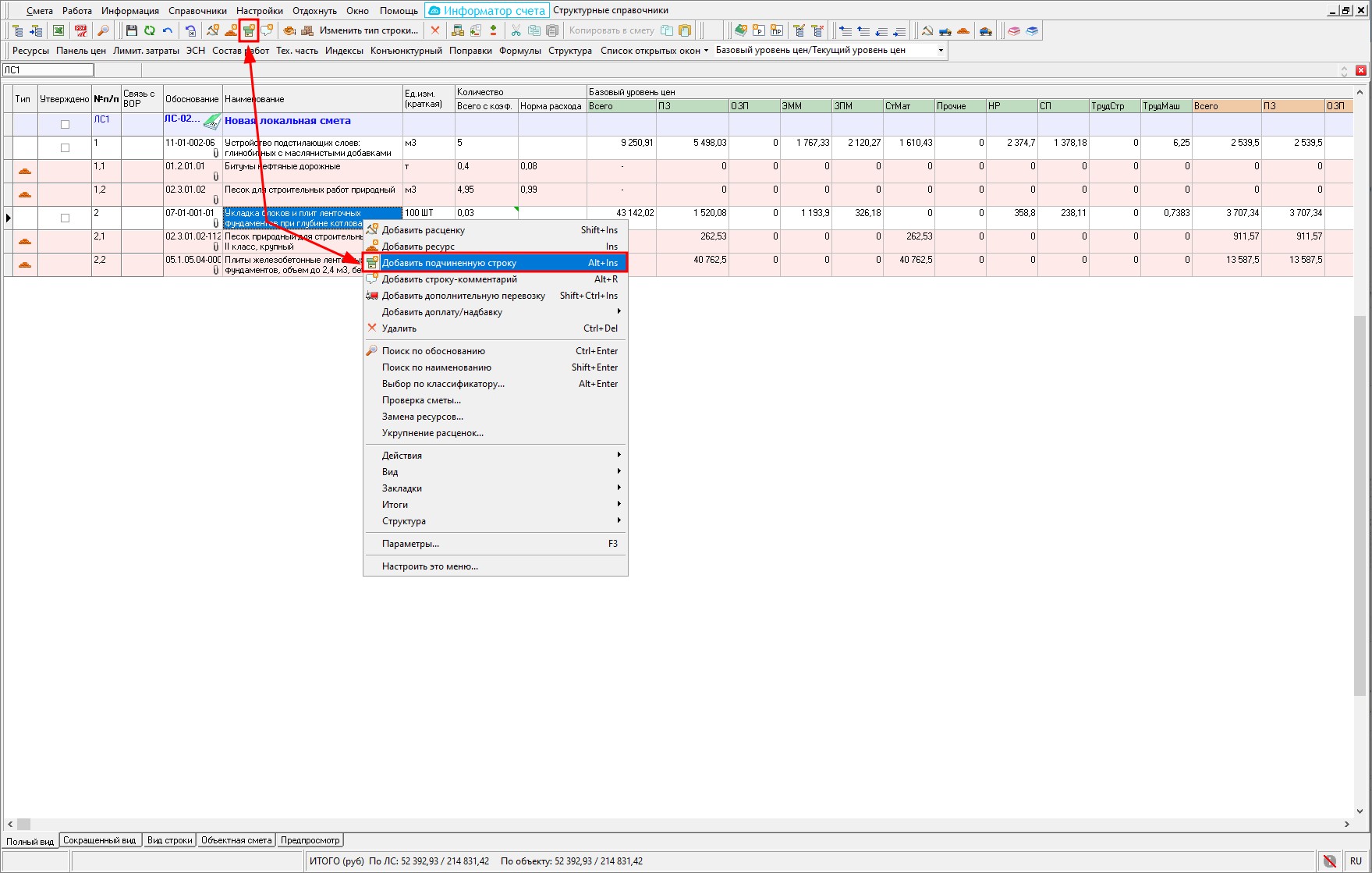 Для добавления ресурса на строке в смете нажмите правой кнопкой мыши и выберите "Добавить подчиненную строку", либо соответствующую кнопку на панели инструментов