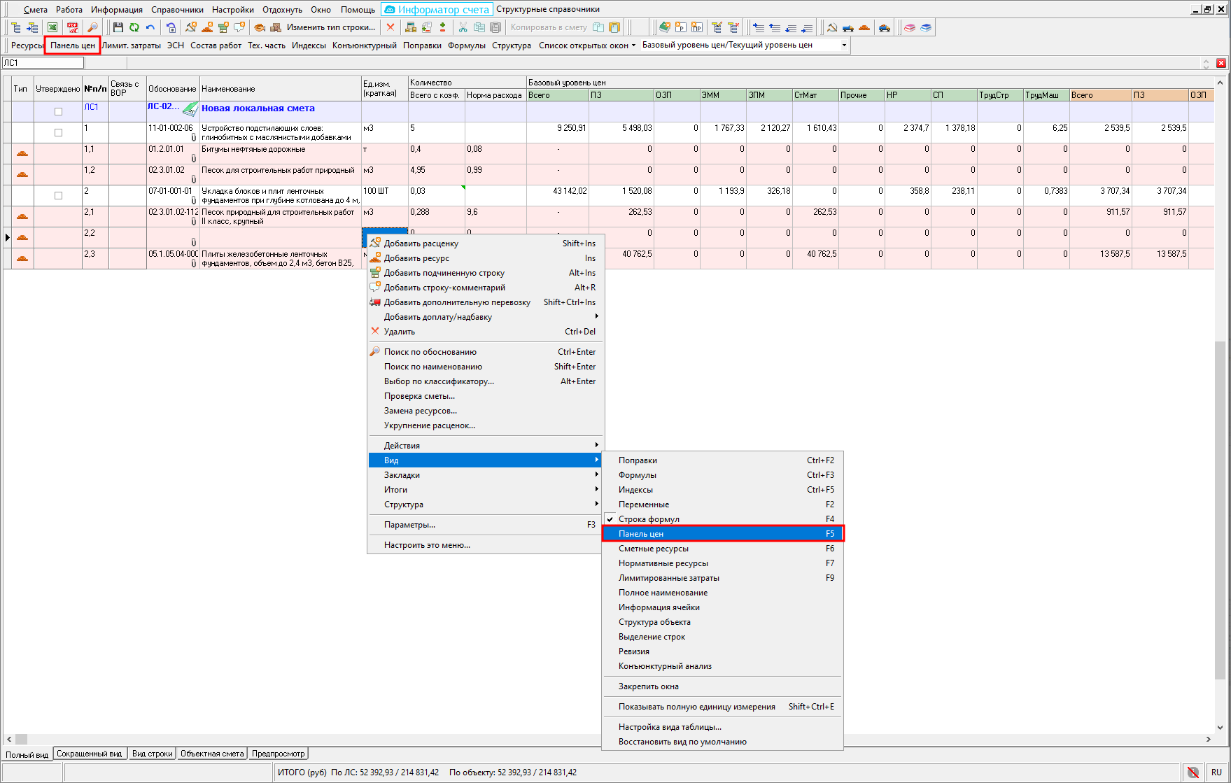 Внесите обоснование, наименование и единицу измерения. Для того, чтобы внести цену нажмите на панели инструментов "Панель цен", либо правой кнопкой мыши, пункт "Вид" - "Панель цен"