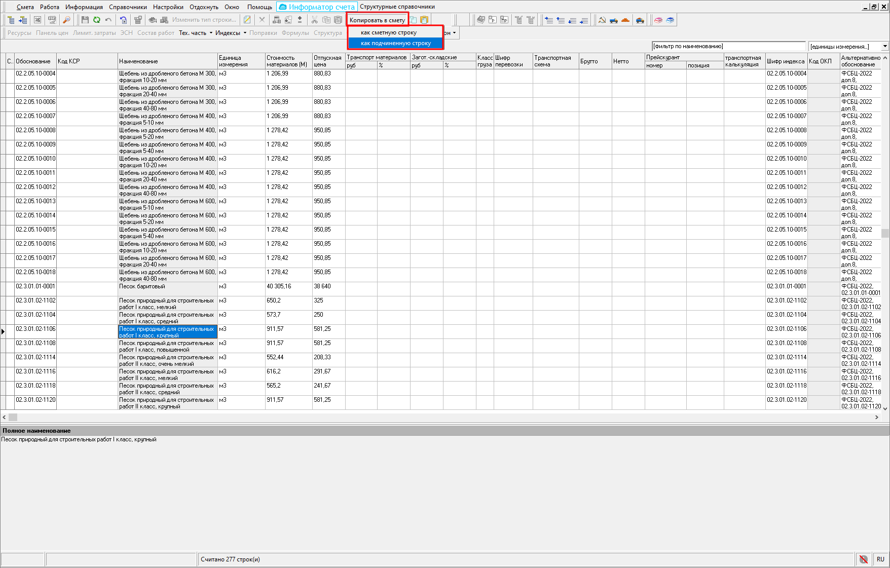 Будет открыт сборник однотипных материалов, выберите ресурс и нажмите на панели инструментов «Копировать в смету» - «как подчиненную строку», либо нажмите правой кнопкой мыши и выберите аналогичные пункты. Подтвердите списание средств за использование норматива