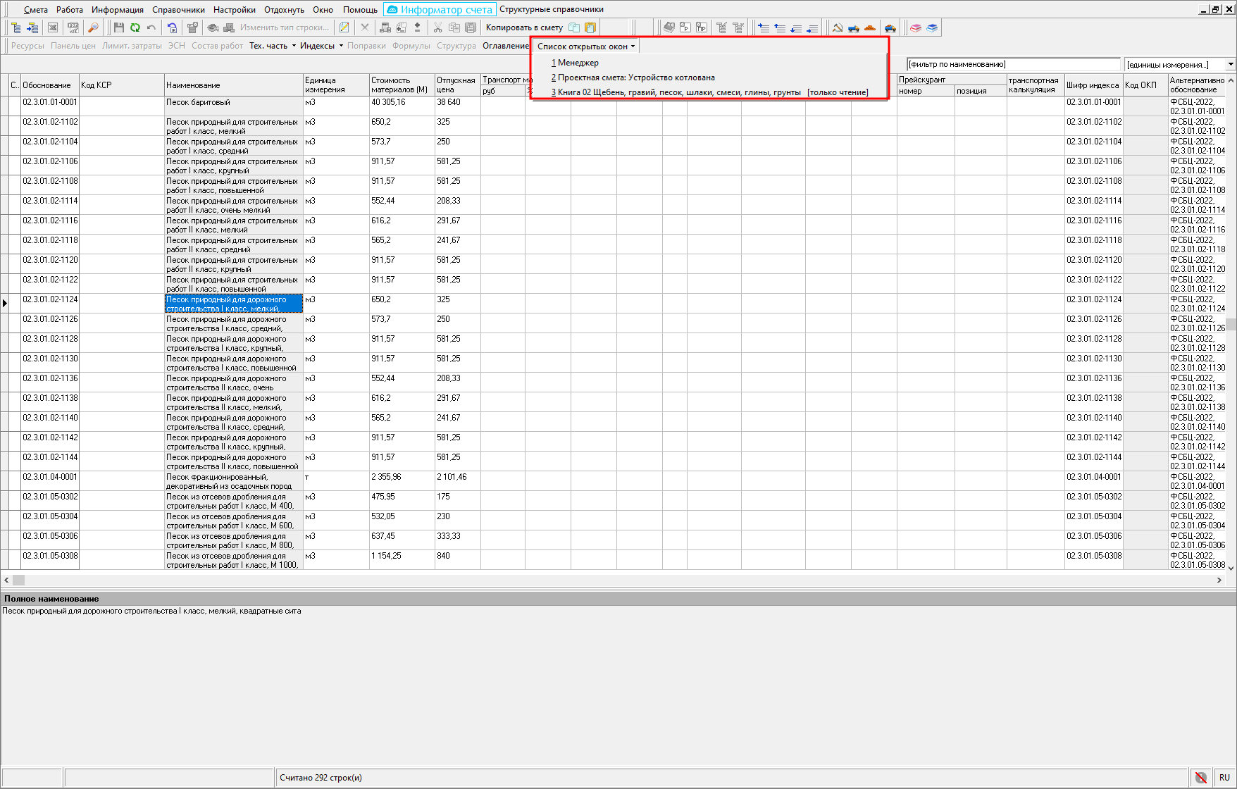Для перехода в окно сметы нажмите на панели инструментов "Список открытых окон" и выберите смету