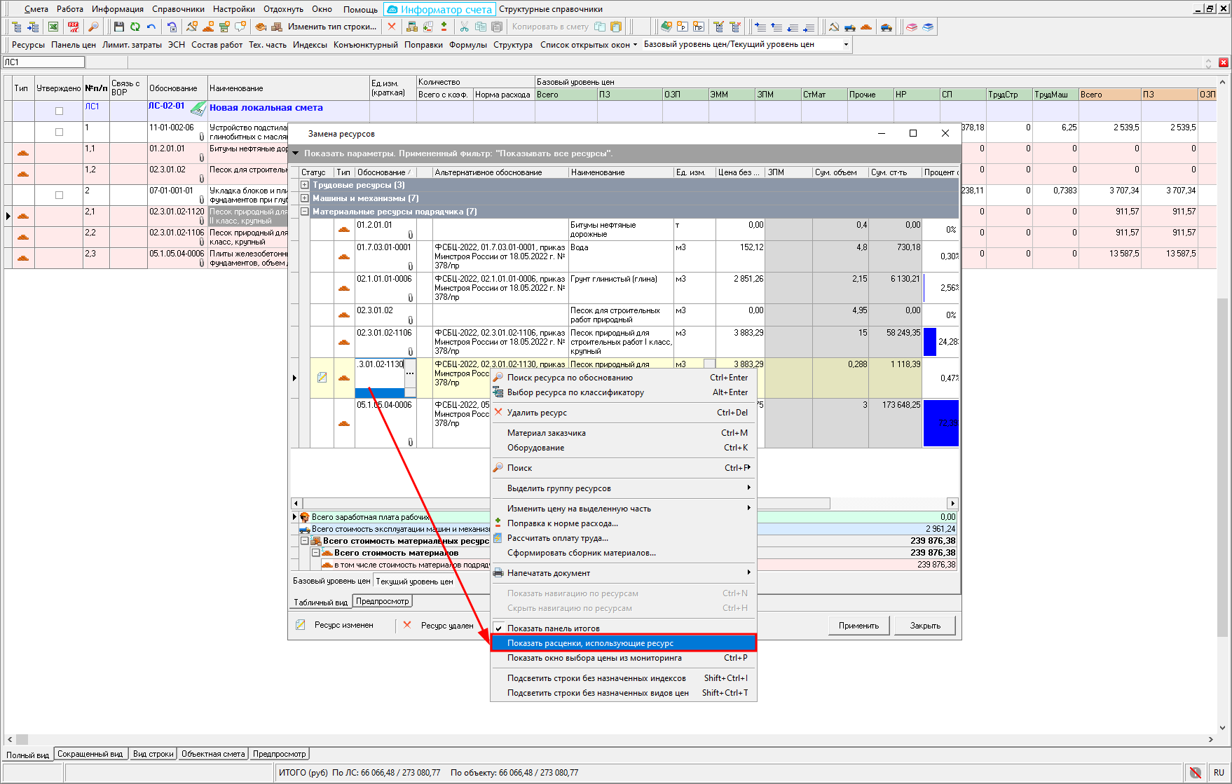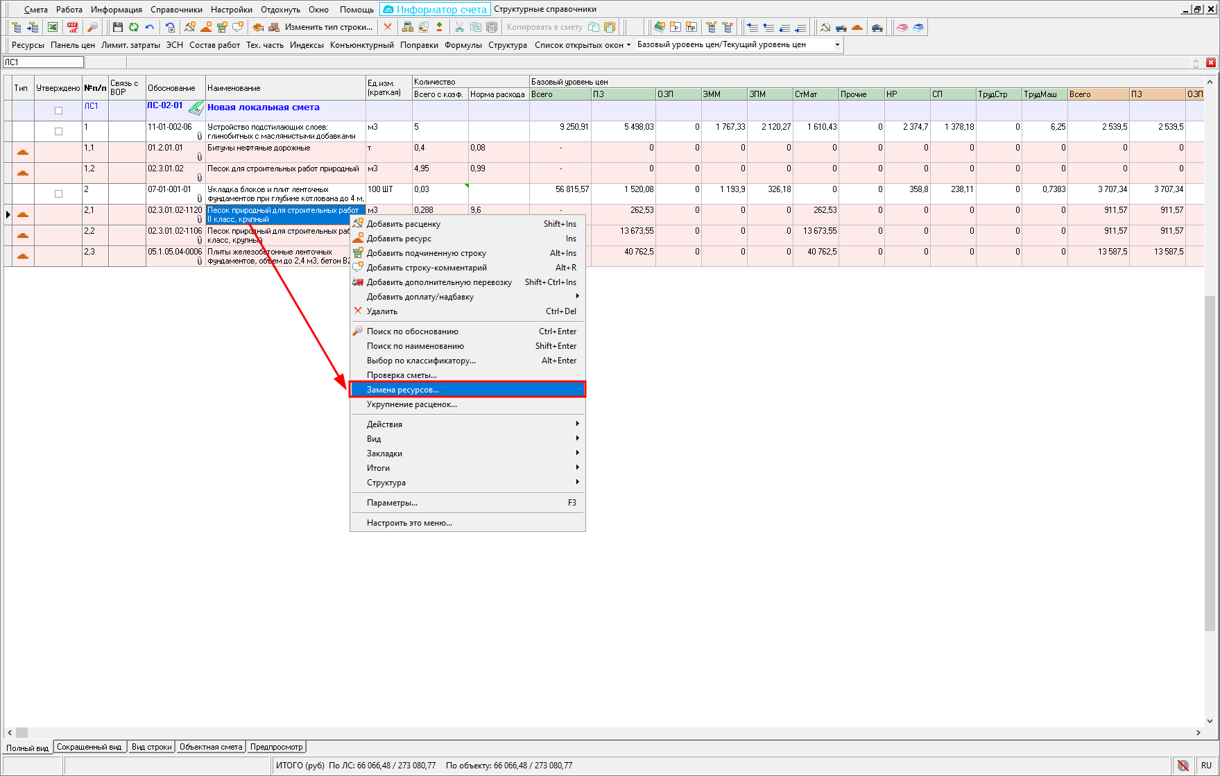 В открытой смете нажмите правой кнопкой мыши, выберите пункт "Замена ресурсов"