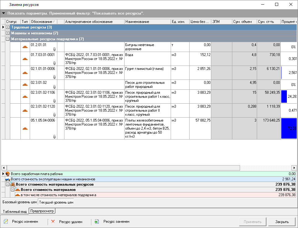 В окне "Замена ресурсов" отображаются все ресурсы по смете: Трудовые, Машины и механизмы и Материальные ресурсы
