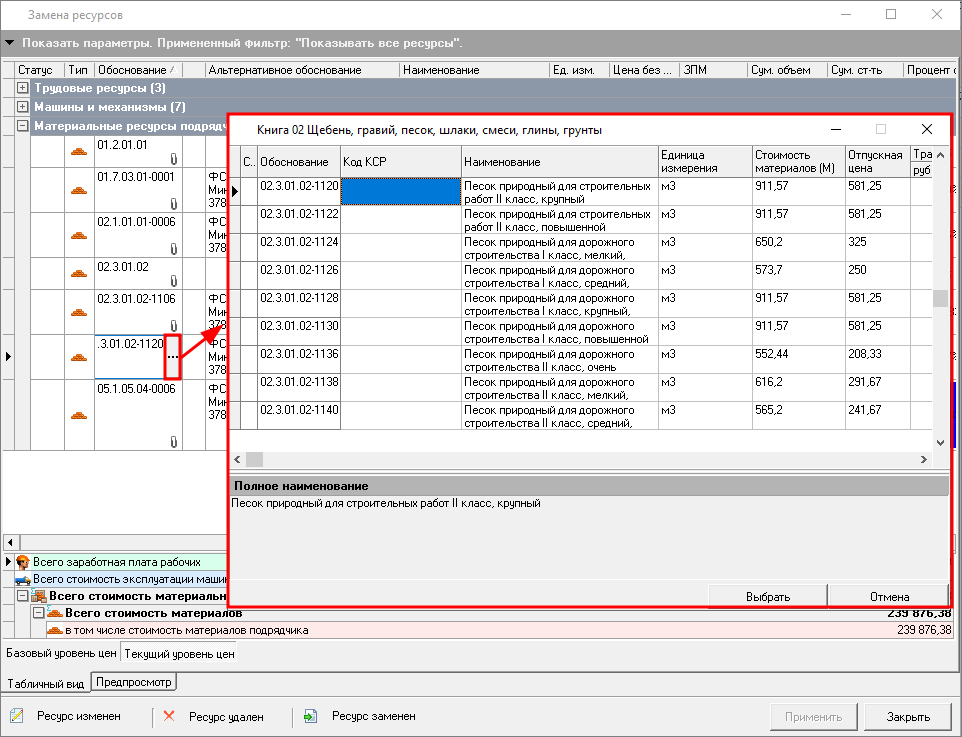 Выберите ресурс, который необходимо заменить, нажмите в колонке "Обоснование" и нажмите на многоточие. Выберите сборник ресурсов. Укажите нужный ресурс и нажмите "Выбрать"
