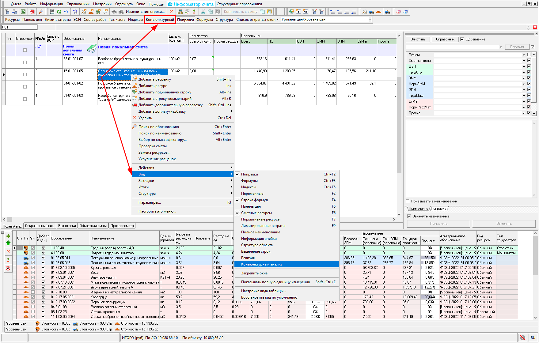 В отрытой смете нажмите на панели инструментов "Конъюнктурный", либо нажмите правой кнопкой мыши и выберите "Вид" - "Конъюнктурный анализ"
