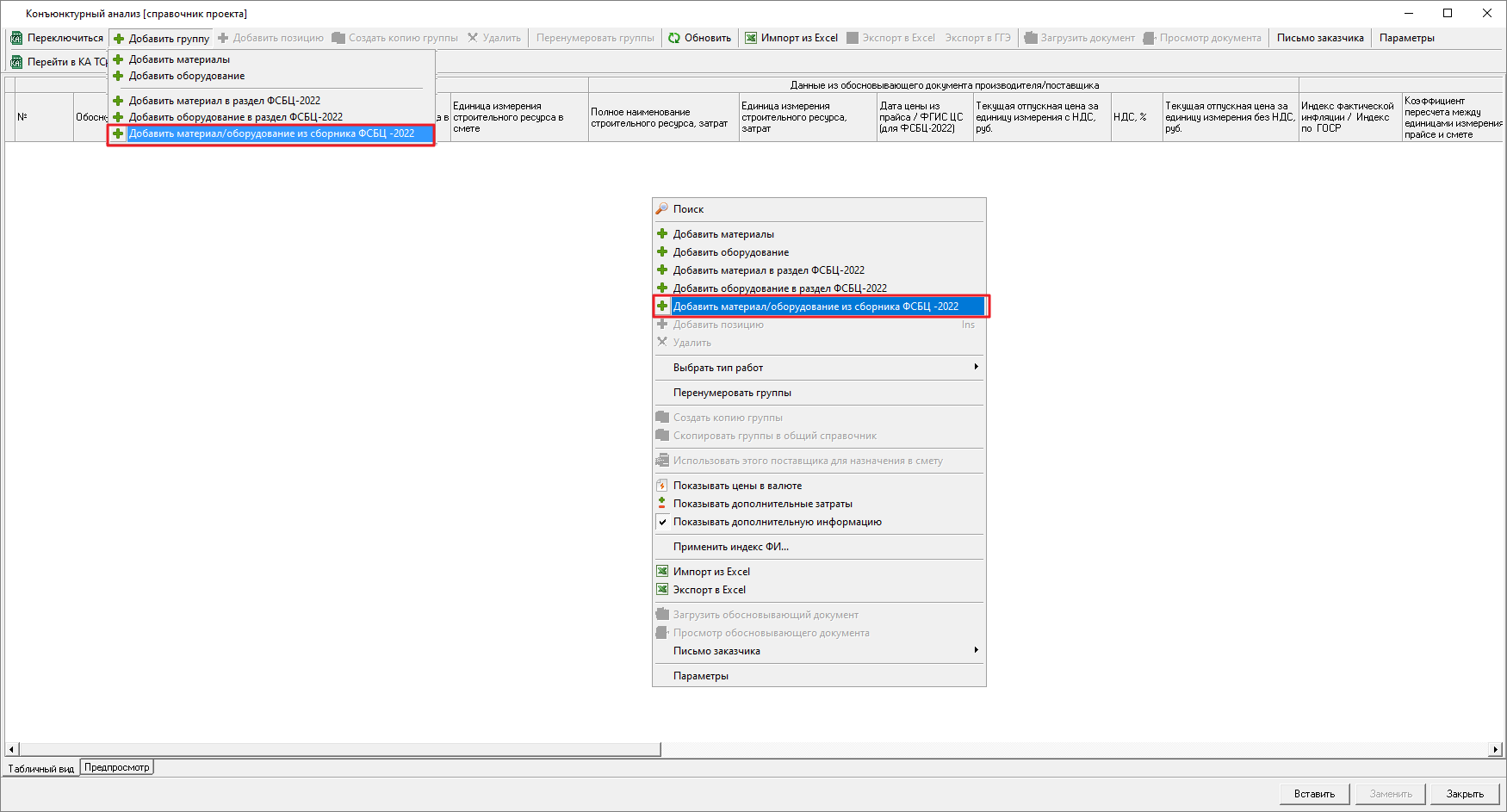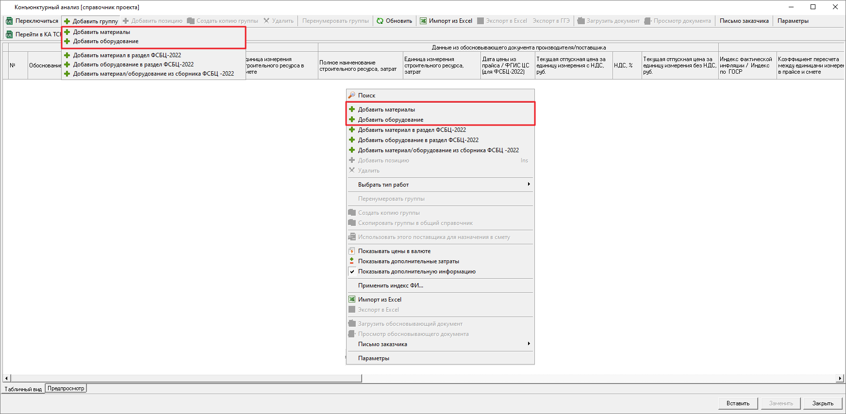 Для добавления группы строк в раздел "Конъюнктурный анализ" нажмите на панели инструментов "Добавить группу" и выберите добавить группу материалов или оборудования, либо нажмите правой кнопкой мыши и выберите пункт "Добавить материалы" или "Добавить оборудование"