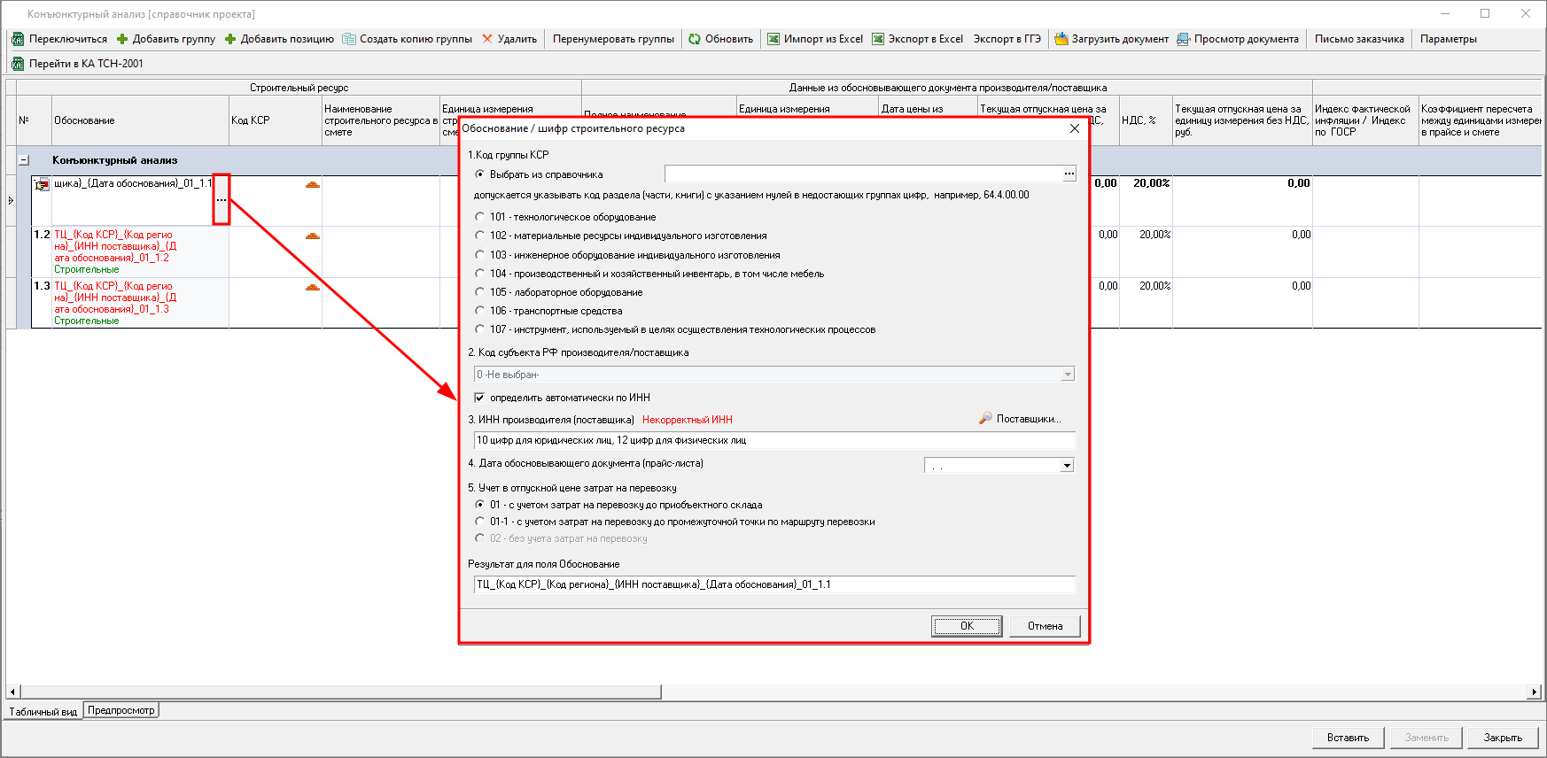 В колонке "Обоснование" нажмите левой кнопкой мыши и нажмите на многоточие. Будет открыто окно "Обоснование/шифр строительного ресурса". Заполните данные и нажмите "ОК"