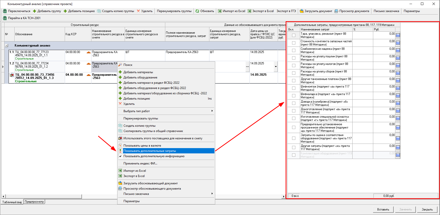 Для внесения дополнительных затрат нажмите правой кнопкой мыши и выберите пункт "Показать дополнительные затраты". Внесите необходимые затраты в числовом или % значении