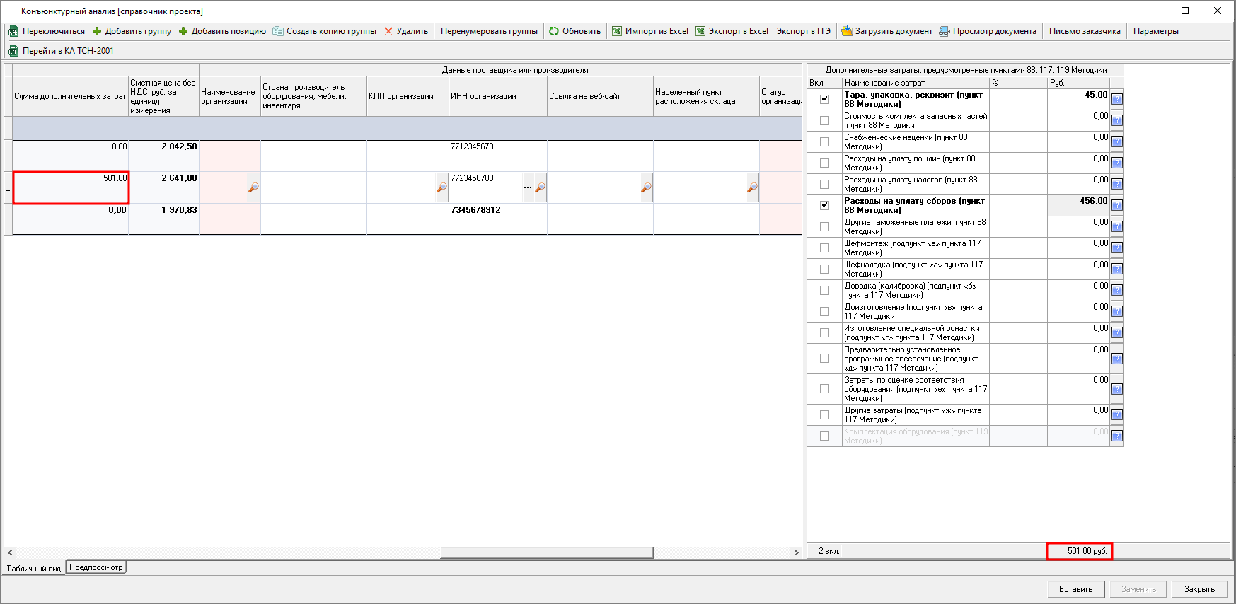 Дополнительные затраты будут суммированы и внесены в колонку "Сумма дополнительных затрат"