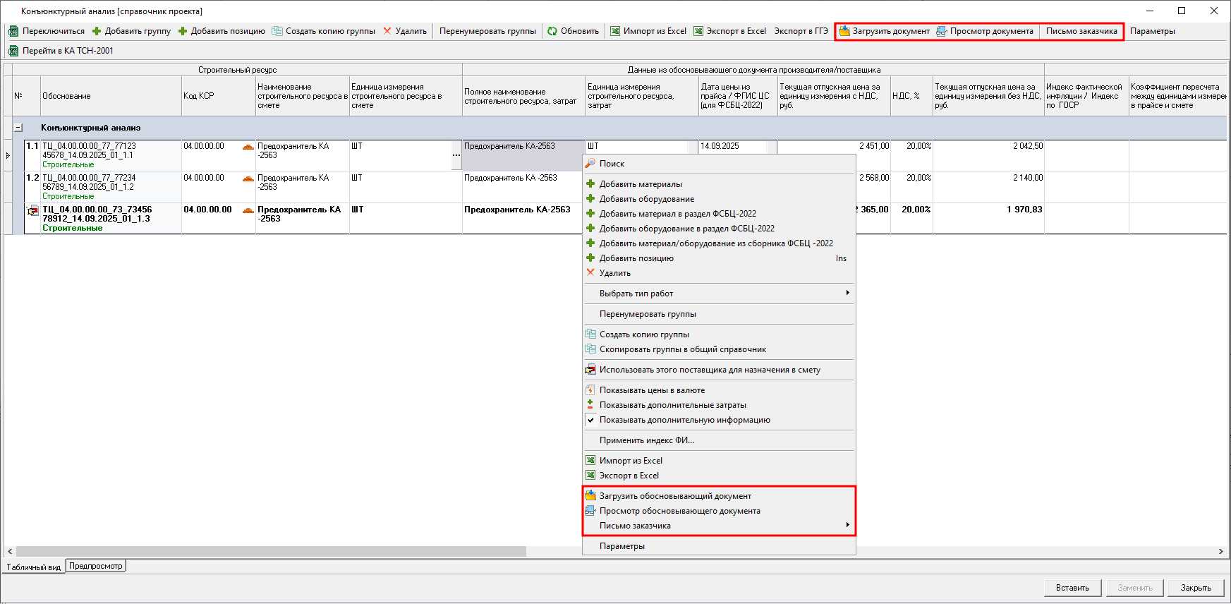 Для загрузки и просмотра обосновывающих документов или письма заказчика нажмите соответствующие кнопки на панели инструментов, либо нажмите правой кнопкой мыши и выберите "Загрузить обосновывающий документ", "Просмотр обосновывающего документа" или "Письмо заказчика"