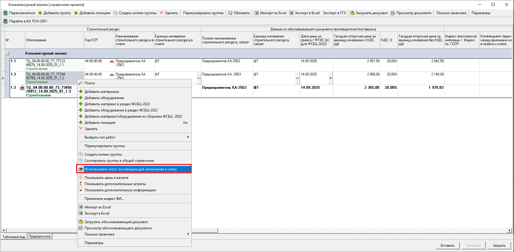 Выбор ресурса в группе с минимальной стоимостью производится автоматически, такой ресурс выделен жирным шрифтом и в колонке "№" имеет индикацию. При необходимости использовать другой ресурс нажмите на нем правой кнопкой мыши и выберите "Использовать этого поставщика для назначения в смету"
