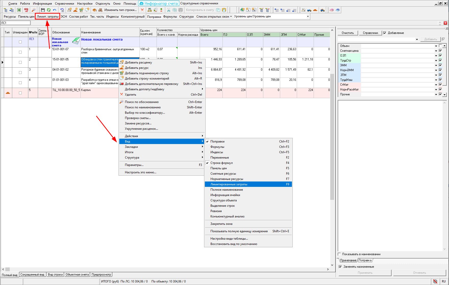 В открытой смете на панели инструментов нажмите "Лимит. затраты", либо правой кнопки мыши, выберите пункт "Вид" - "Лимитированные затраты"