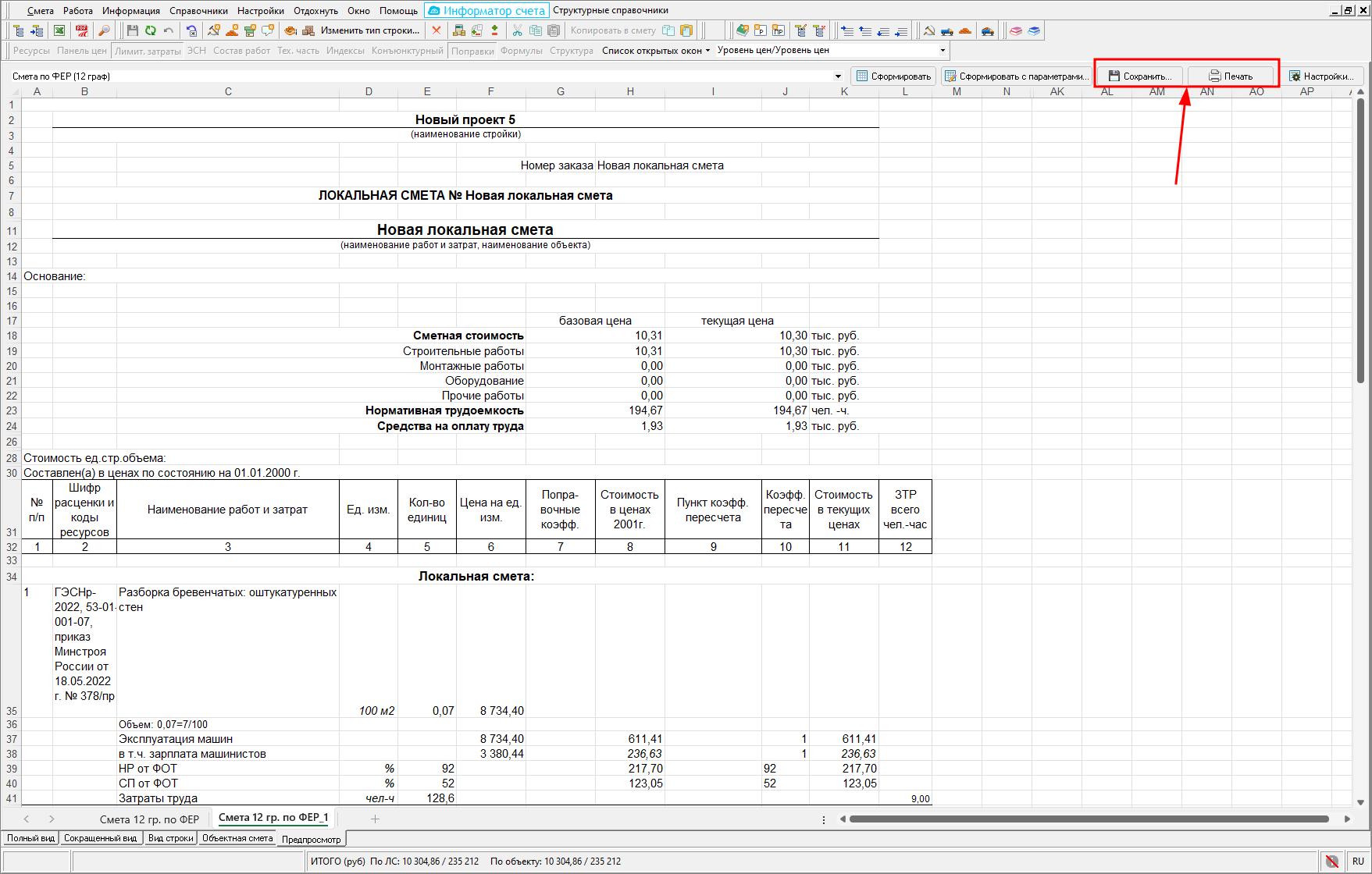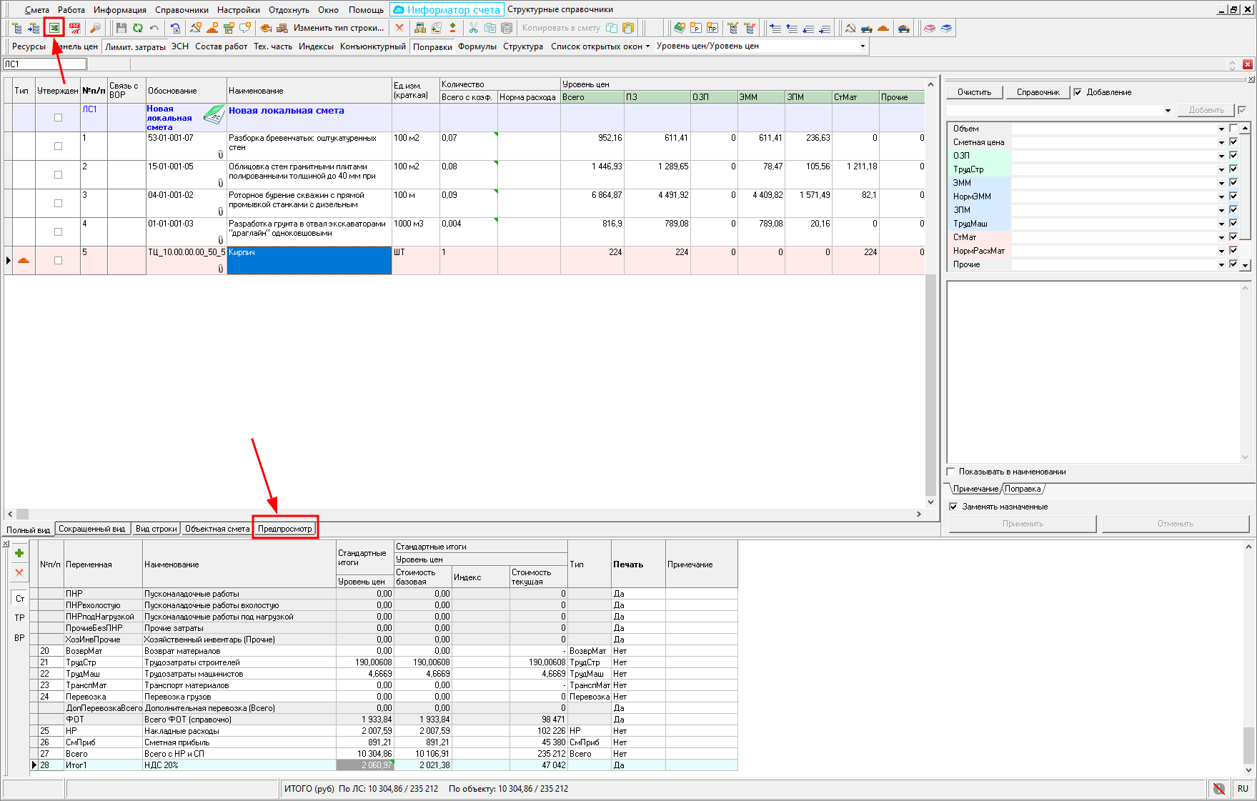 Для того чтобы распечатать смету, перейдите на вкладку "Предпросмотр" или нажмите на панели инструментов "Экспорт в Excel"