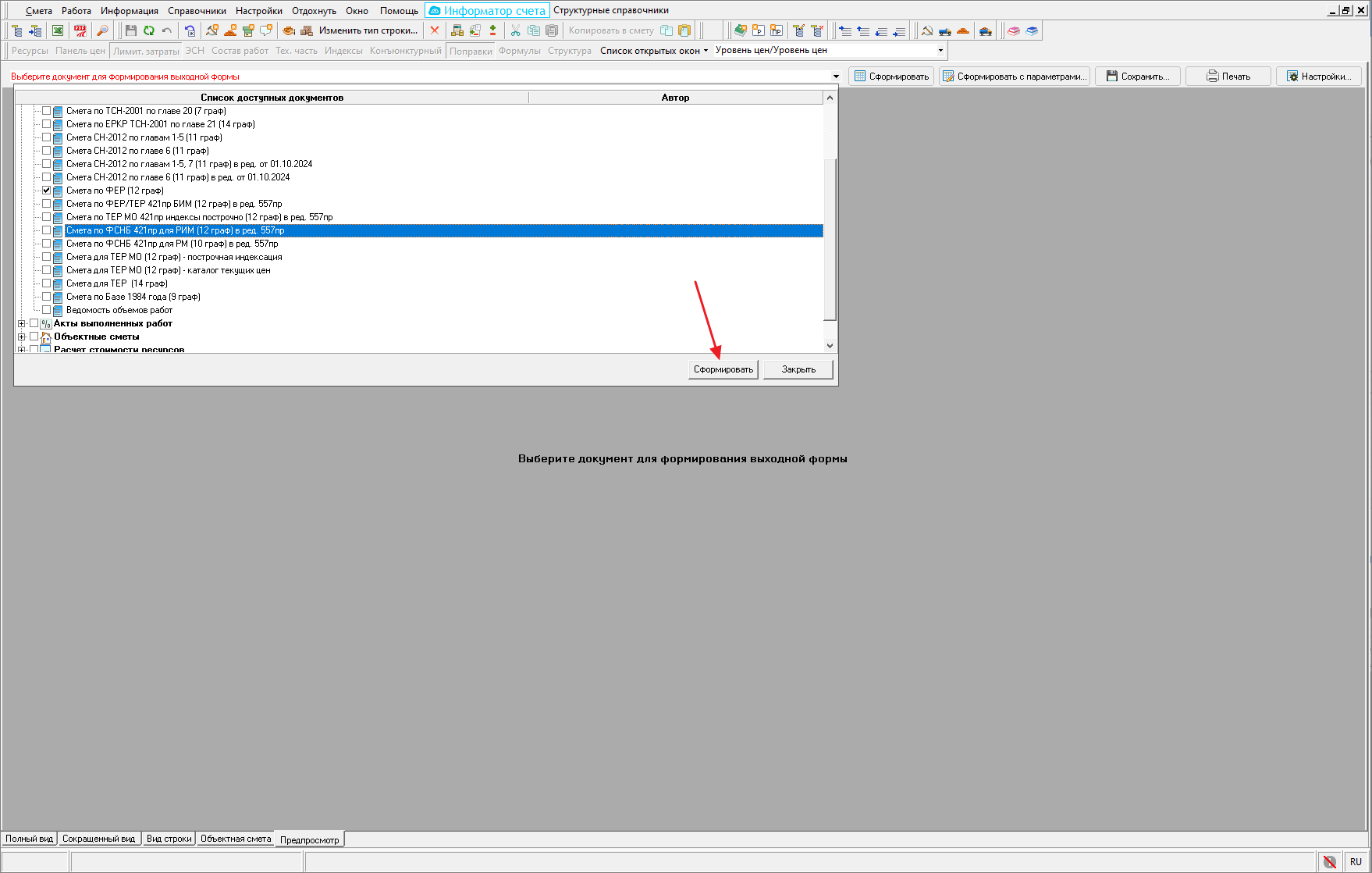 В окне «Список доступных документов» выберите нужный документ и нажмите «Сформировать»