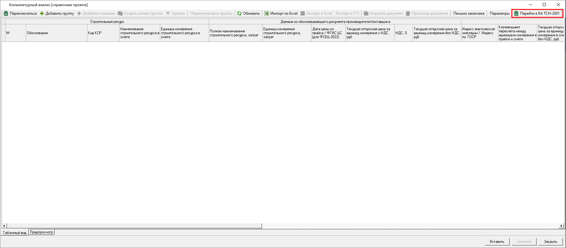 В случае необходимости, переключить вид отображения конъюнктурного анализа для ТСН-2001 можно вручную. Для этого в открытом справочнике конъюнктурного анализа на панели инструментов нажмите "Перейти в КА ТСН-2001"