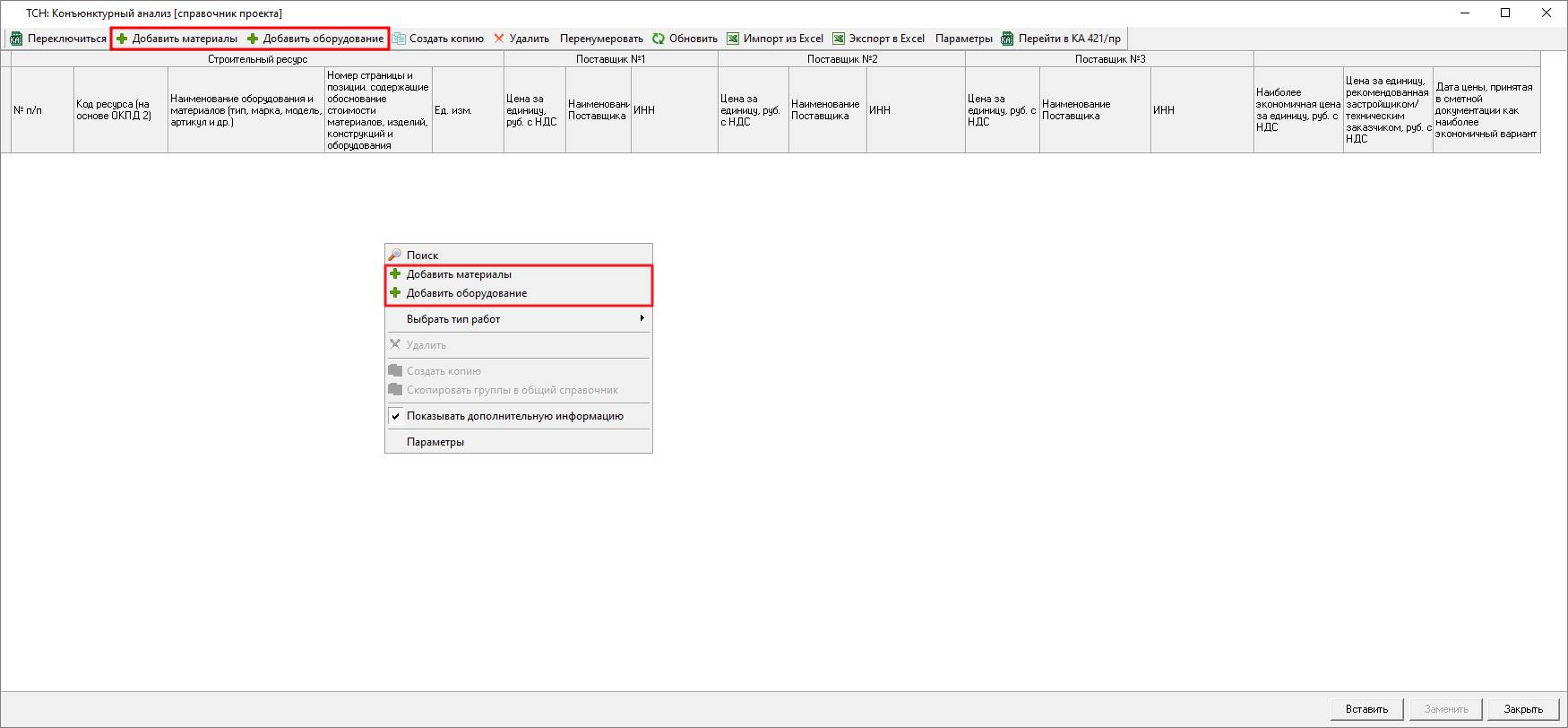 Для добавления строк нажмите на панели инструментов "Добавить материалы" или "Добавить оборудование". В контекстном меню доступны аналогичные пункты
