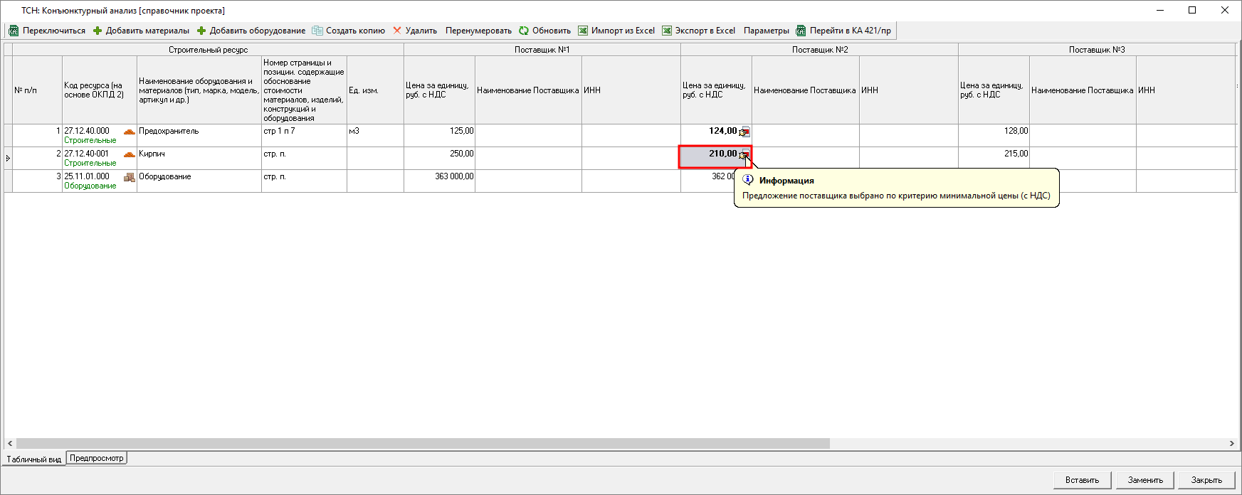 По результатам конъюнктурного анализа на основании данных в колонках "Поставщик №1", "Поставщик №2", "Поставщик №3" автоматически будет заполнена колонка "Наиболее экономичная цена за единицу, руб. с НДС".