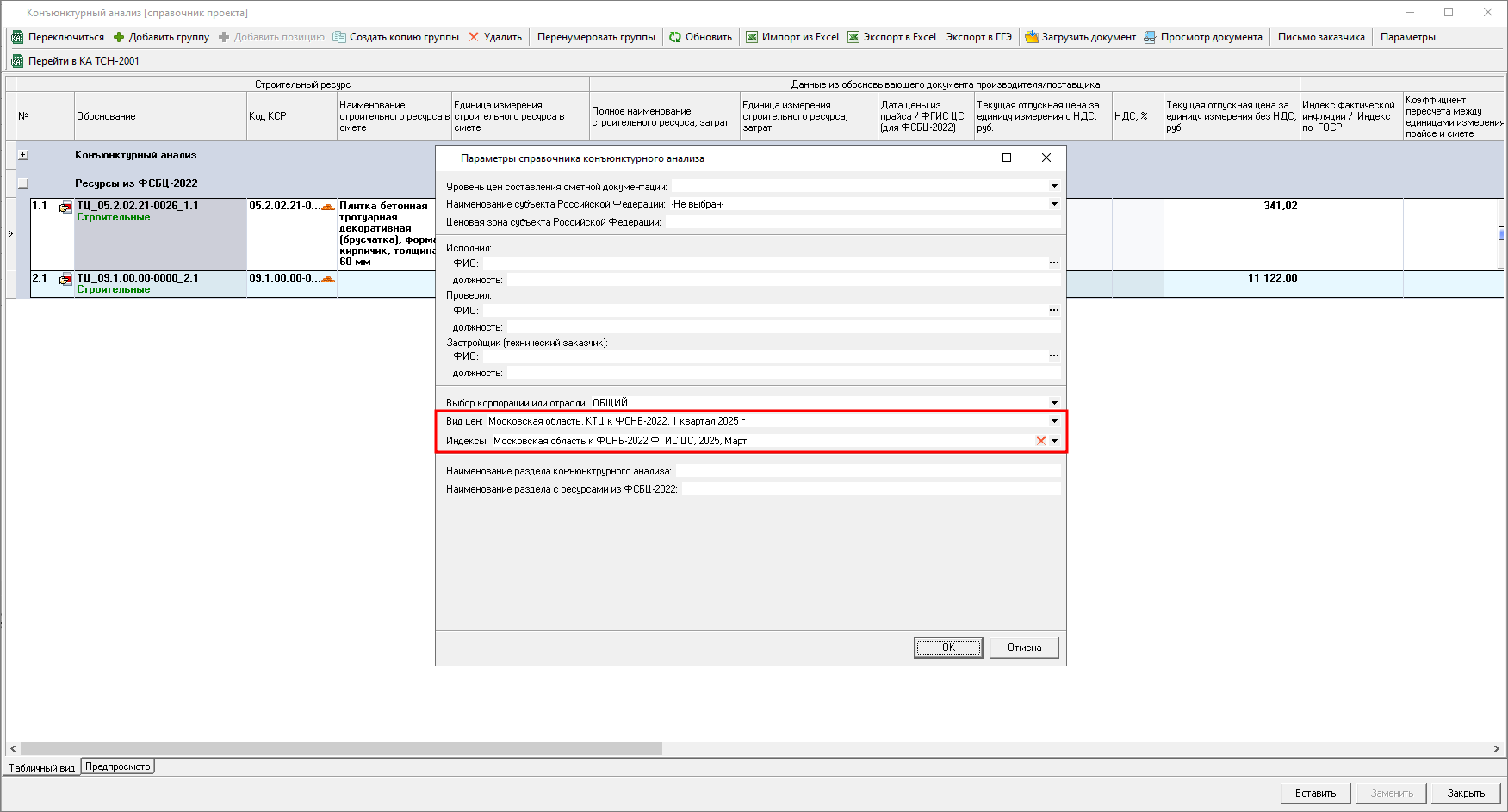 Для строк раздела "Ресурсы из ФСБЦ-2022" доступно автоматическое применение индексов и текущих цен из выбранного в параметрах сборника индексов и/или видов цен