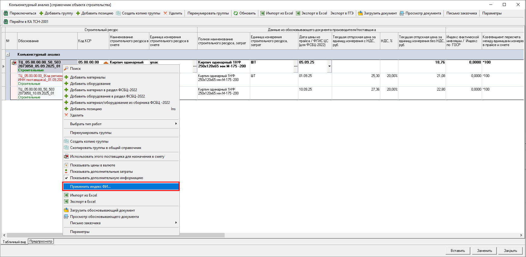 Для автоматического расчета и применения индекса фактической инфляции к строкам, добавленным на основании коммерческих предложений выберите строку (несколько строк), нажмите правой кнопкой мыши, выберите "Применить индекс ФИ..."